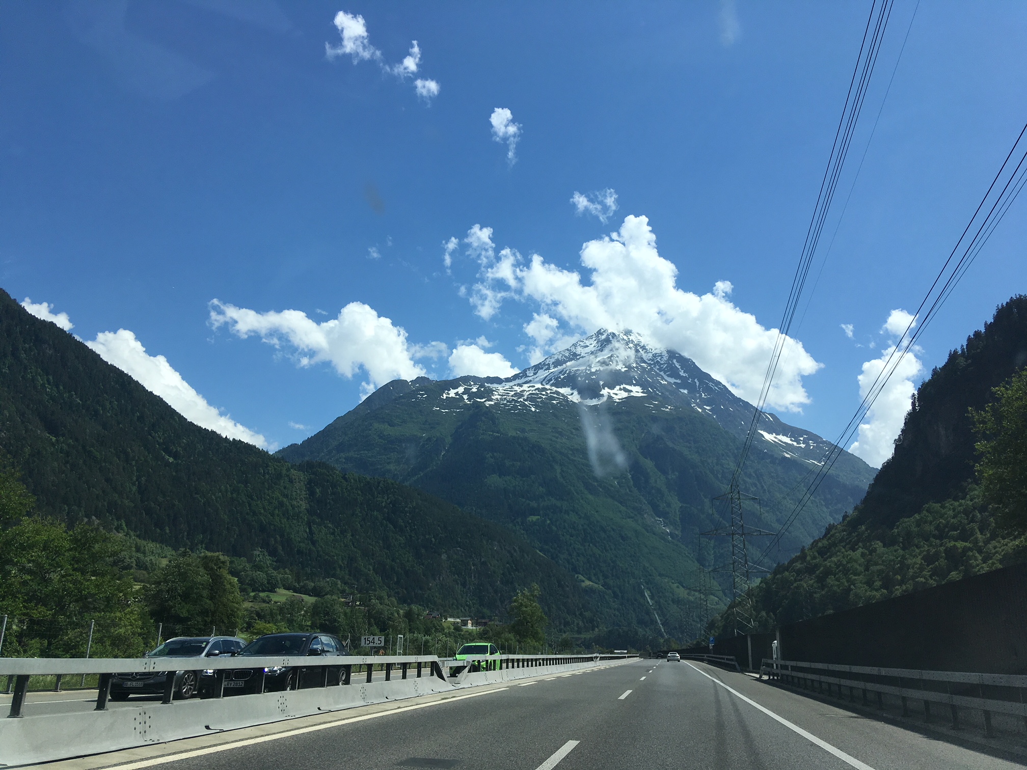 We worden willekeurig in twee fuiken geleid. In tegenstelling tot bij de kassa’s van de Colruyt zitten we vandaag in de snelle rij. De sticker van het wegenvignet die Belinda vooraf bij de Auto5 was gaan halen, is ons toegangsticket tot het zuiverste land van Europa en blijkbaar ook een anti-caravanmaatregel want in de komende honderden kilometers zien we niet één Nederlandse nummerplaat.