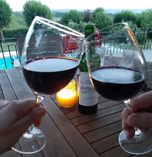 De wijnvertelster geeft ons een magnum 2014 van Chevaliers d’Homs cadeau en een flesje wit voor in de gite.