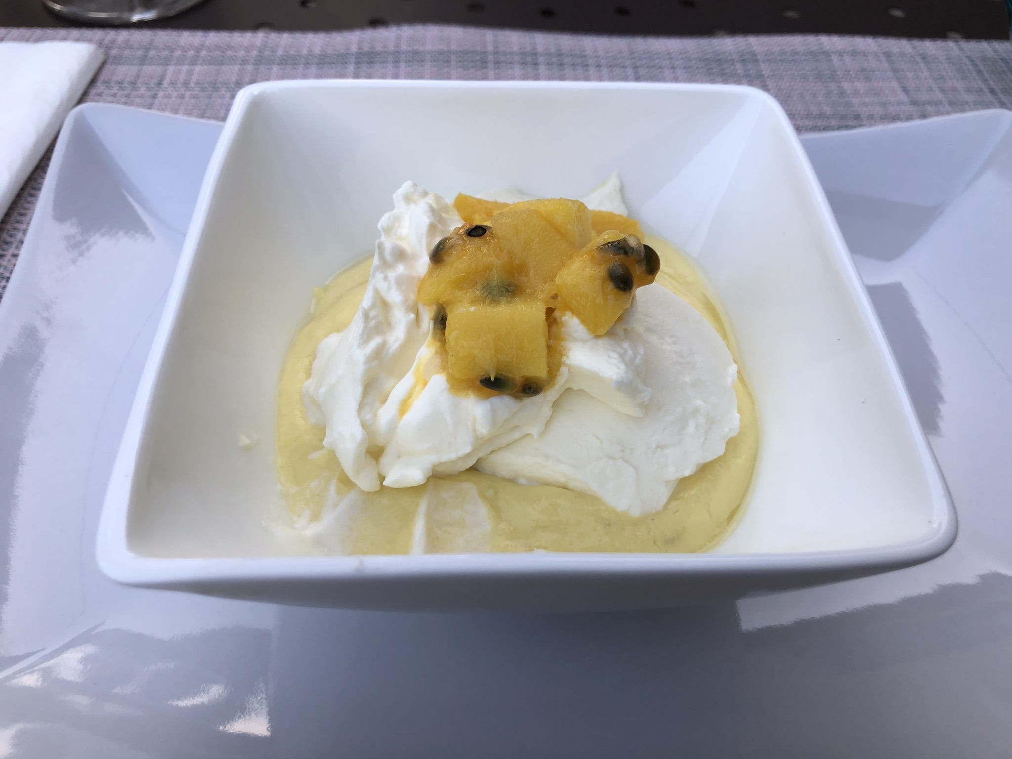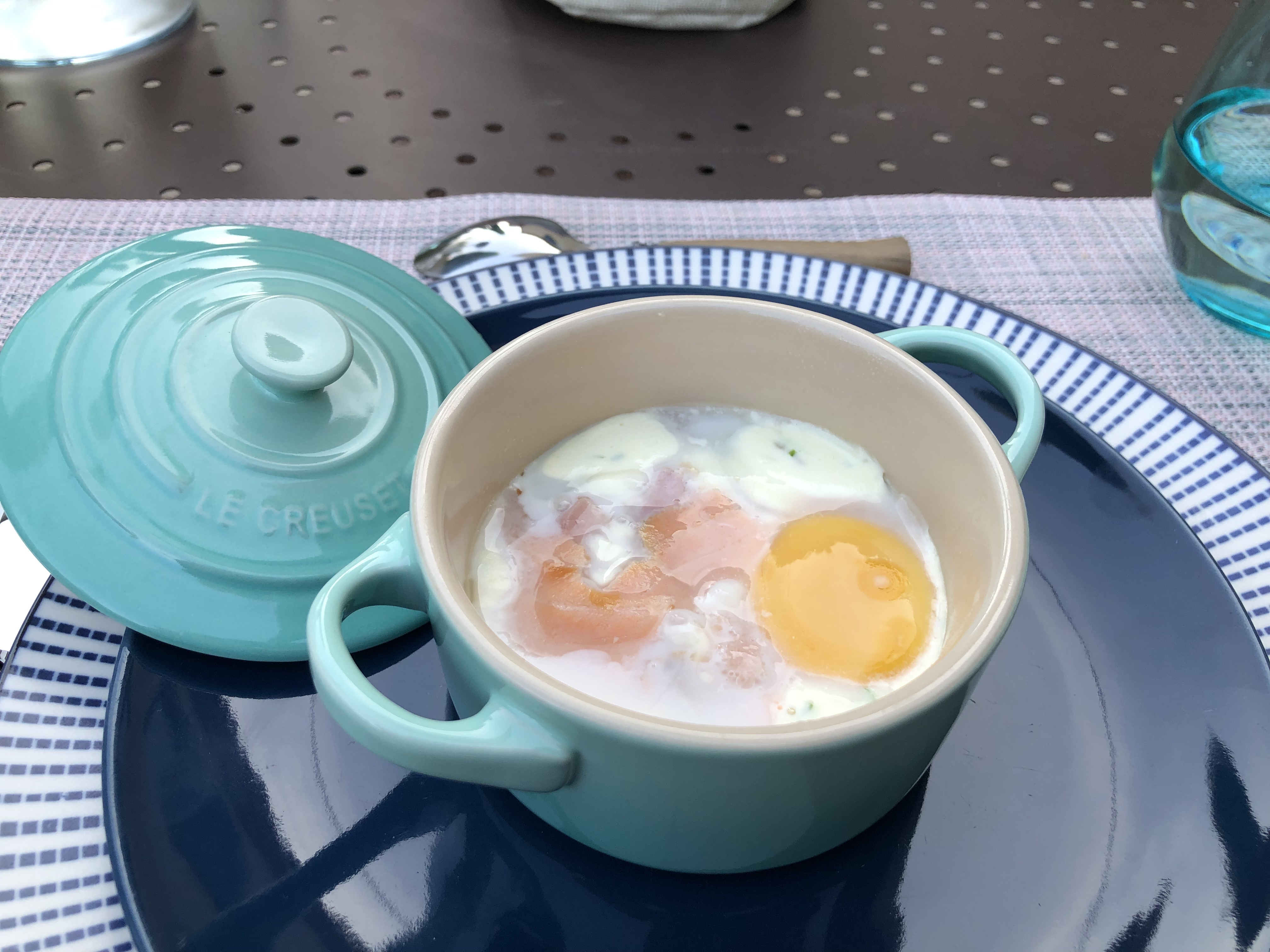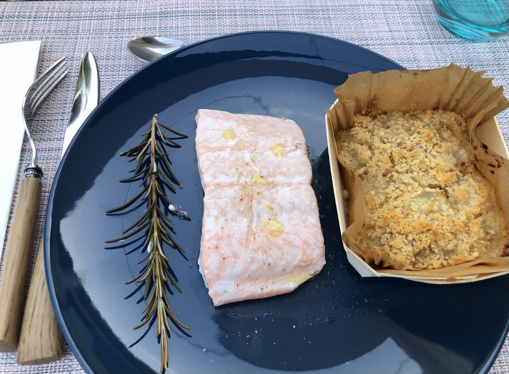De drie gangen vliegen er door. Hervé, de chef van dienst, laat de gerechten vlot doorkomen. Aperohapjes met een wijntje van het huis, een creuset met zalm, spek en ei en een heerlijke baguette om te ‘soppen’, een gestoomde zalm met een crumble van geitenkaas en tomaat en een crème van mango als dessert. Daarna nog een digestiefje en een dubbele espresso met een blokje nougat. Op 70 minuten waren we meer dan voldaan. Voor de prijs moesten we het in elk geval niet laten: 27 euro voor deze weelde.