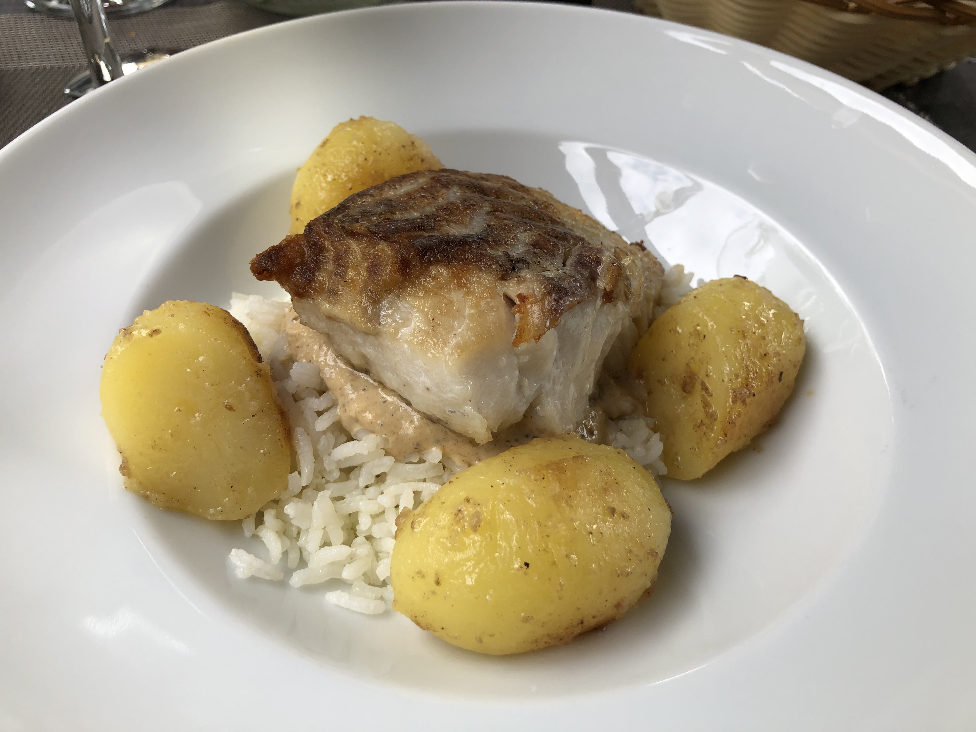 Wij hebben meer tijd en passen ons moeiteloos aan de situatie aan. Dat doet ook de kranige vrouw van in de zestig die ons komt bedienen. Ze staat er alleen voor. 52 plaatsen bedient ze met een zwier, zonder Franse slag. Een menukaart moet ze niet uitdelen, want die is er niet. Wanneer je aankomt, zegt ze één keer wat de voorgerechten, hoofdgerechten en desserts zijn en dan maak je een keuze, en die is telkens beperkt tot 2. Heerlijk efficiënt en zalig voor mensen met keuzestress, zoals jullie dienaar.