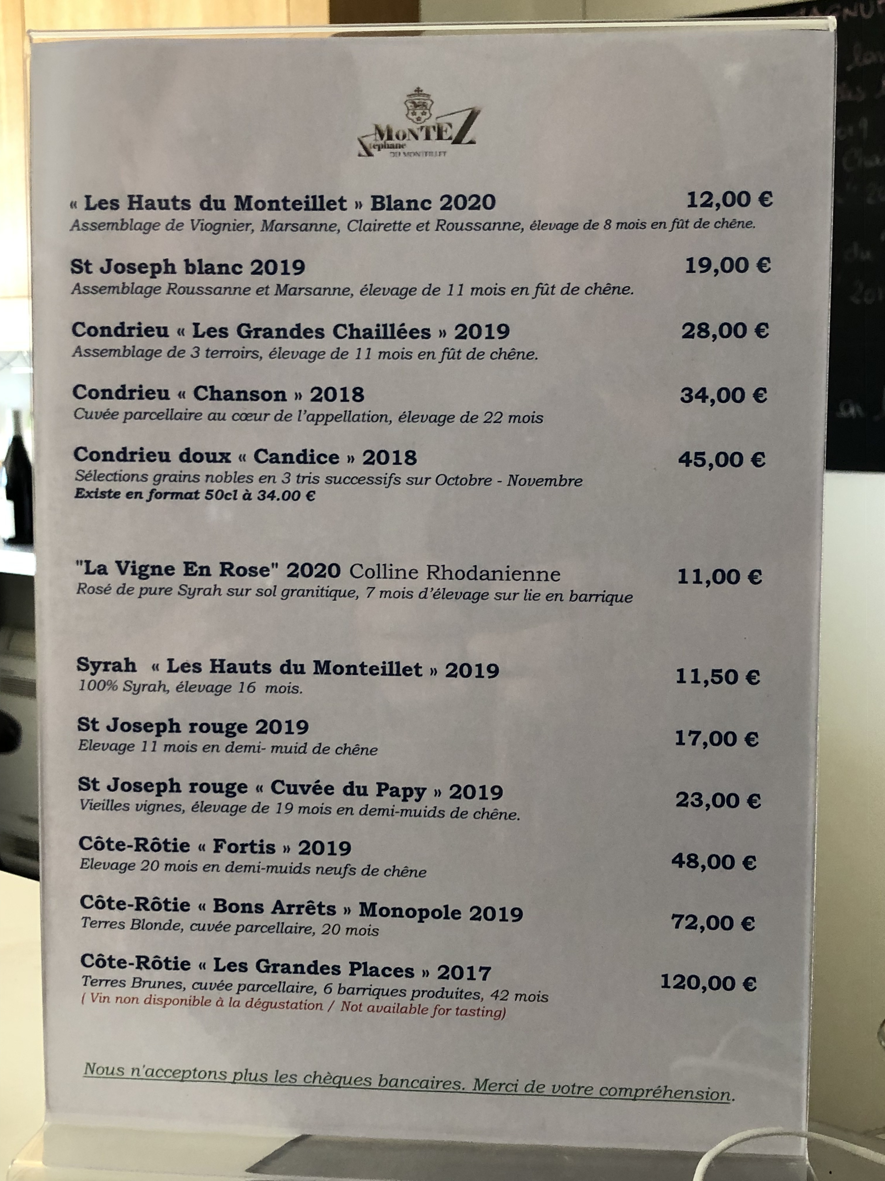 Toch moet je hier als Condrieu- en Saint-Joseph-liefhebber naartoe. Zijn wijnen behoren tot de goedkoopste uit de regio, maar hebben een voortreffelijke kwaliteit. Omdat de witte wijnen geen vatrijping kregen, moet je wel gaan voor een snellere consumptie thuis dan die van Montez bijvoorbeeld, maar dat mag geen probleem zijn, toch?