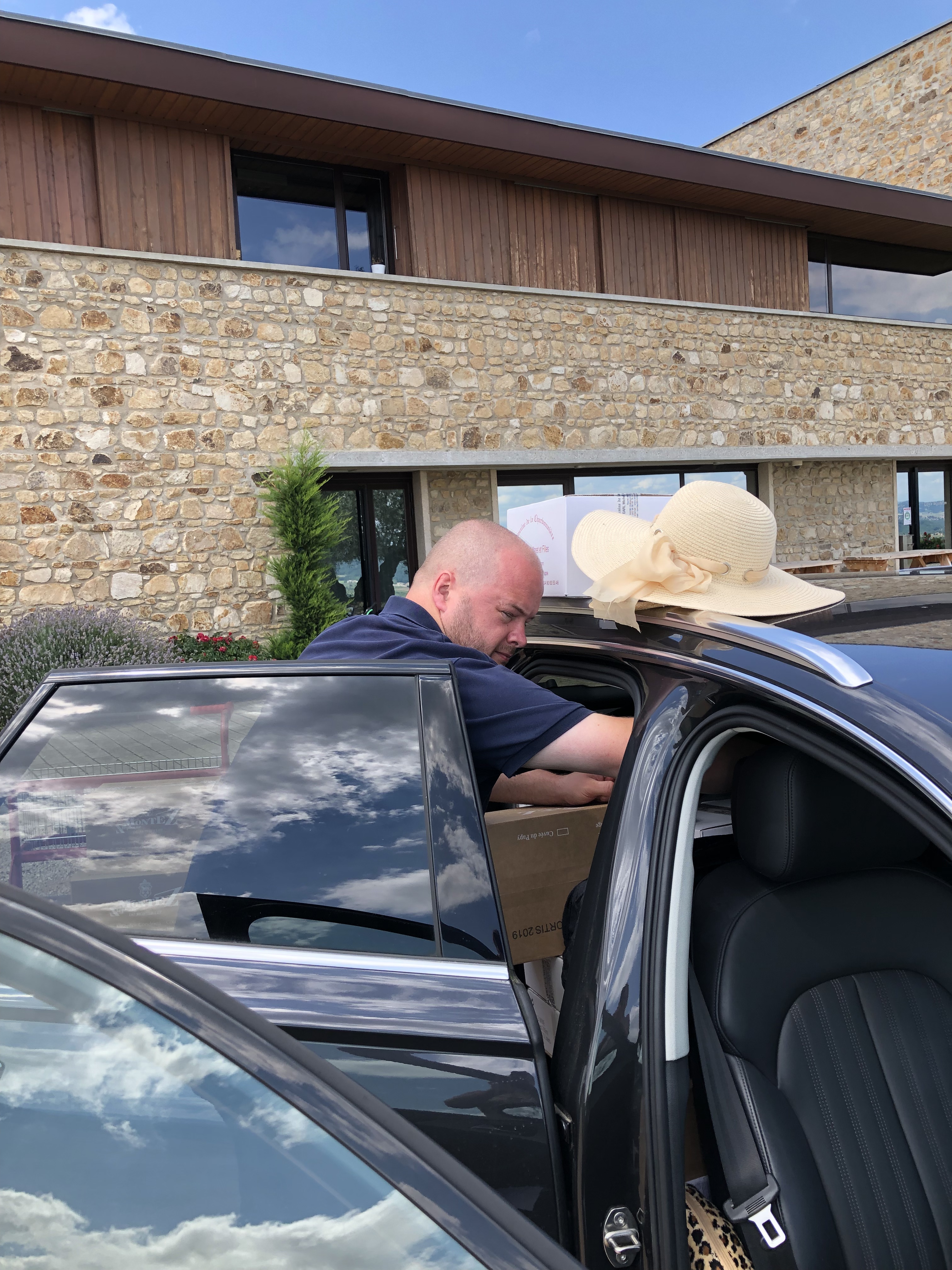 Het gewicht van de gebunkerde wijn, blijkt maar één deel van het probleem te zijn, wanneer ik de dozen in de auto wil zetten. Door de verschillende vormen van de dozen en het krappe volume aan vrije ruimte, voel ik me Ben Crabbé. Tetris spelen met wijndozen.