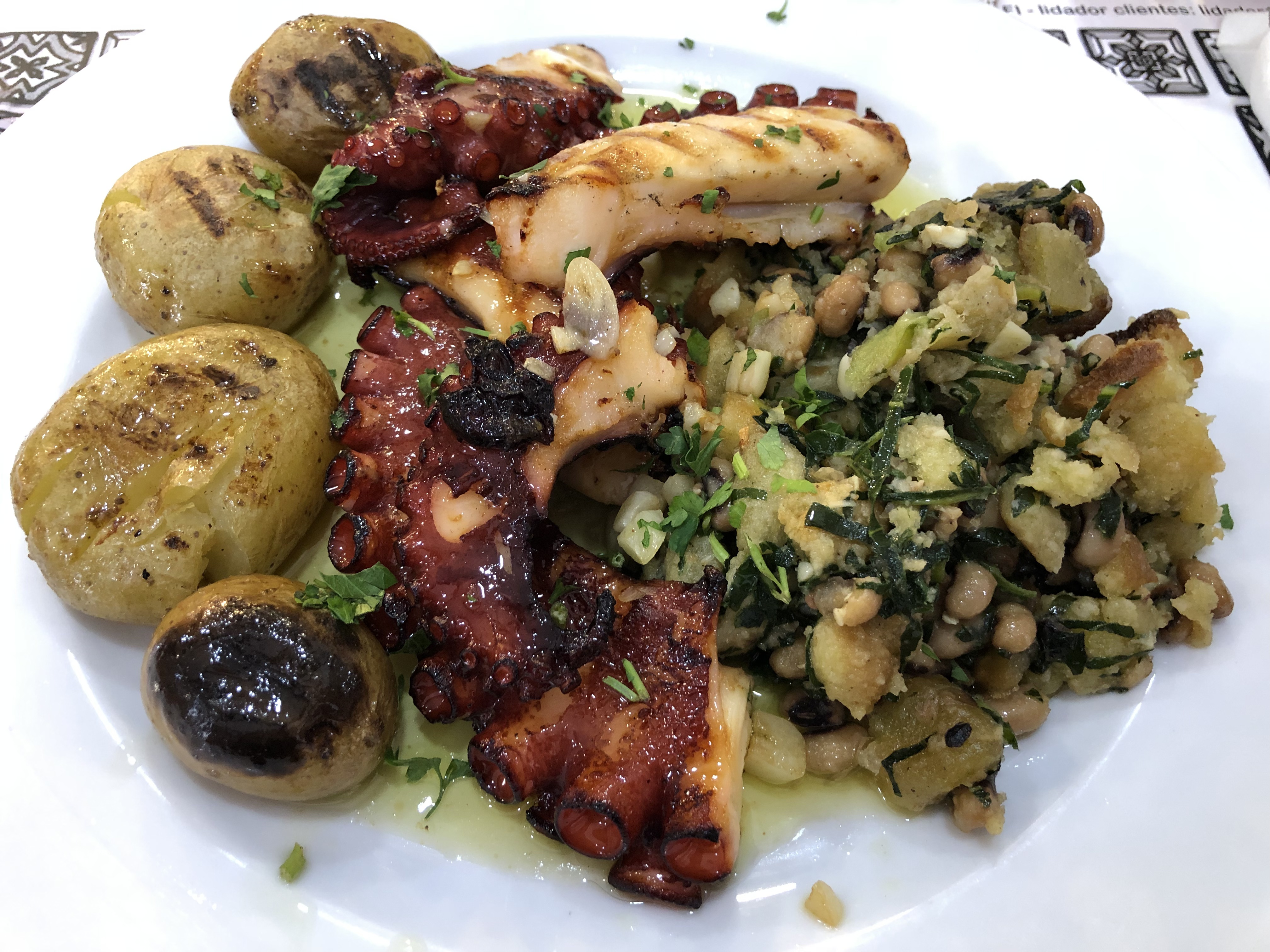 Het eten zelf is lekker en copieus. De gigantische inktvis op mijn bord figureerde ooit nog in een boek van Jules Verne toen het beest de schuit van kapitein Nemo de dieperik in wilde trekken. Hij eindigt vreedzaam en wordt overspoeld door een passende witte topper van Adega Mayor.
