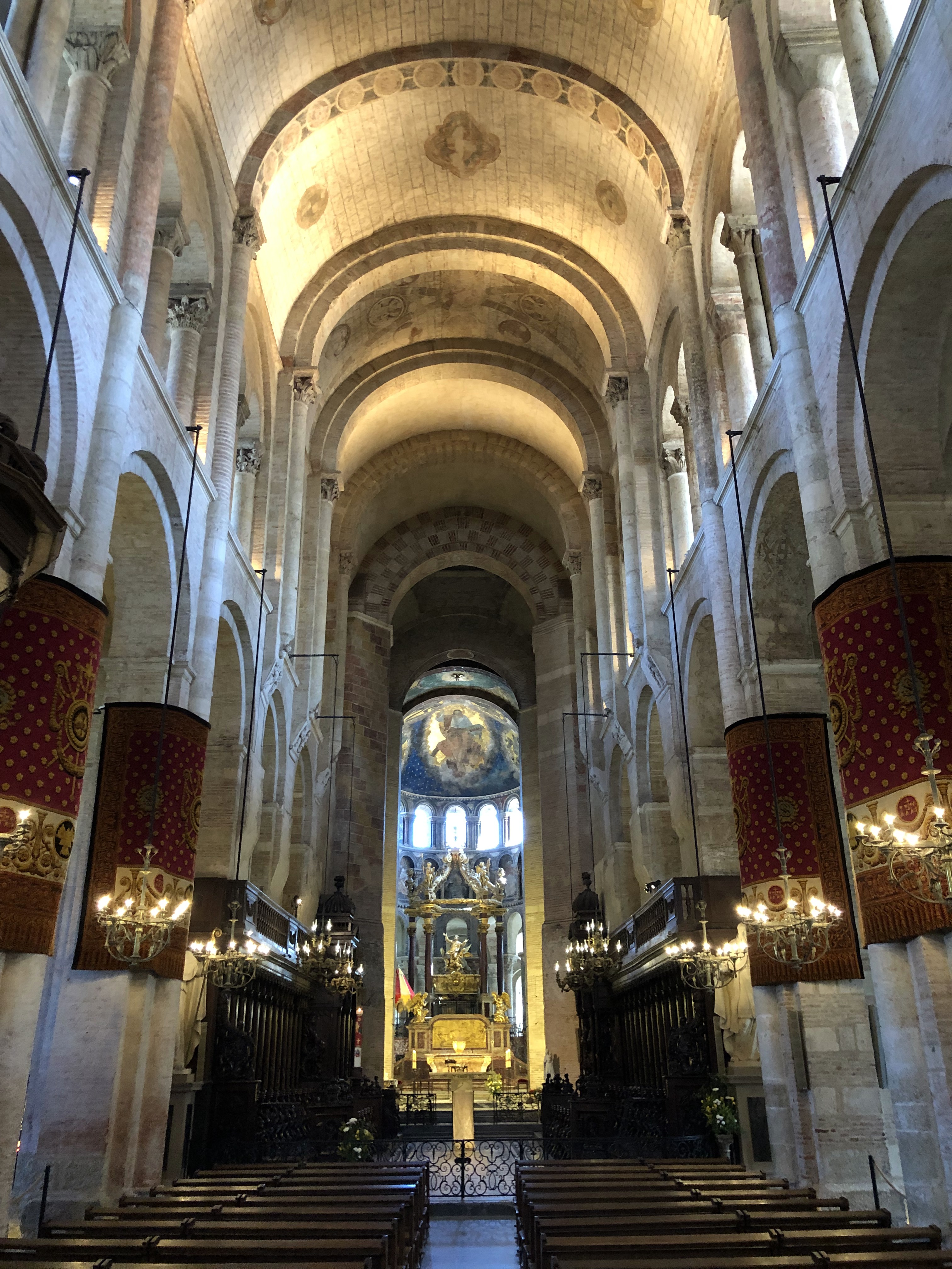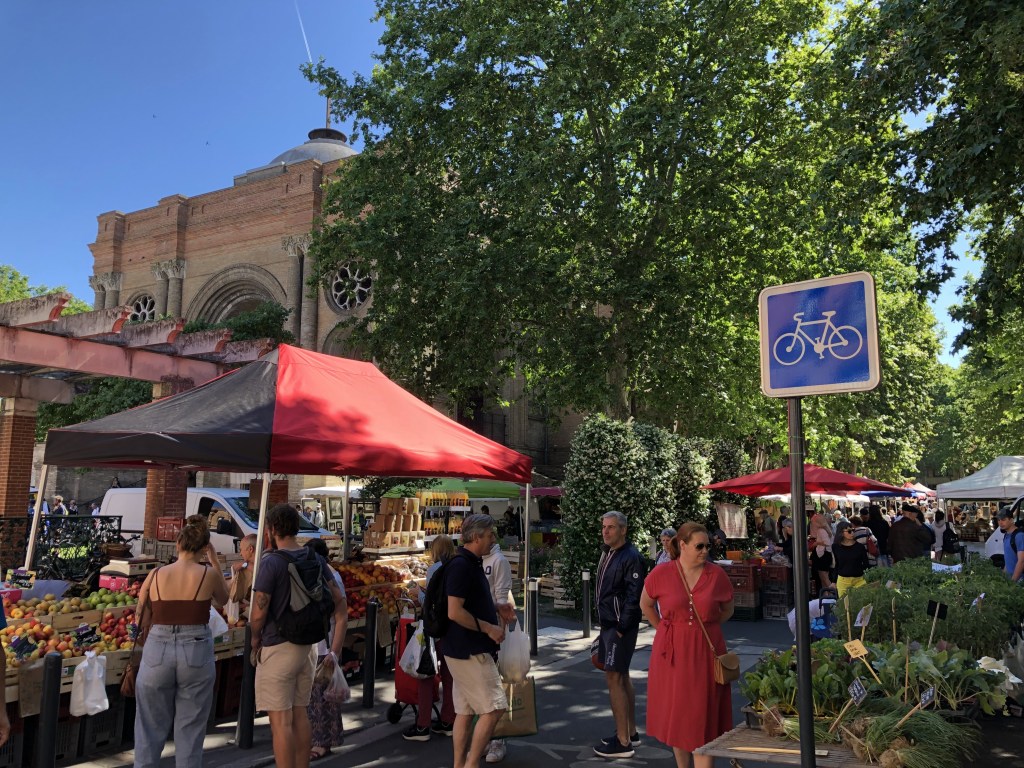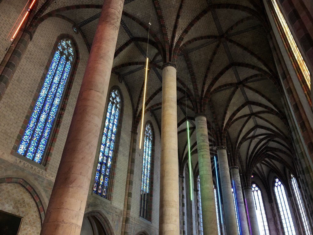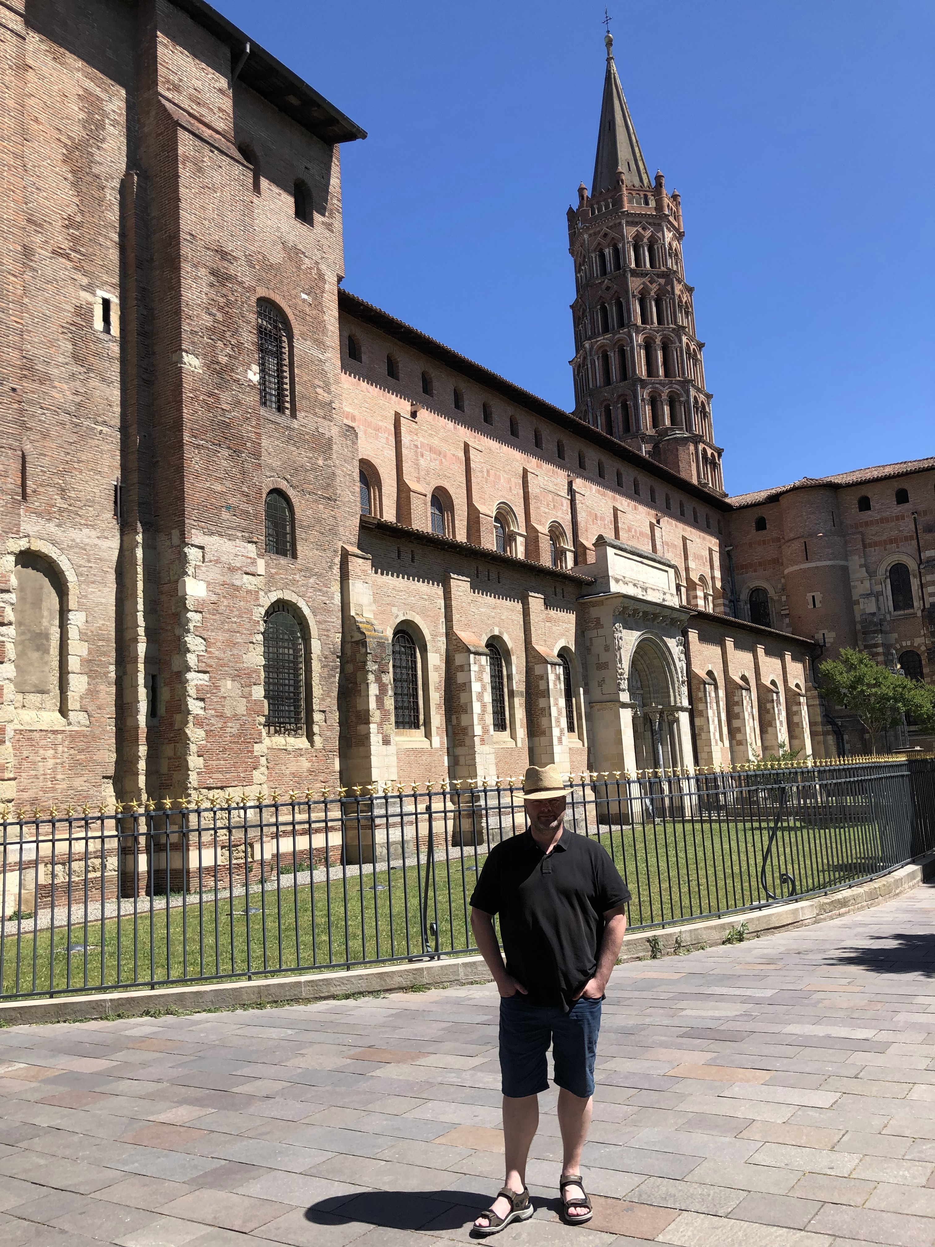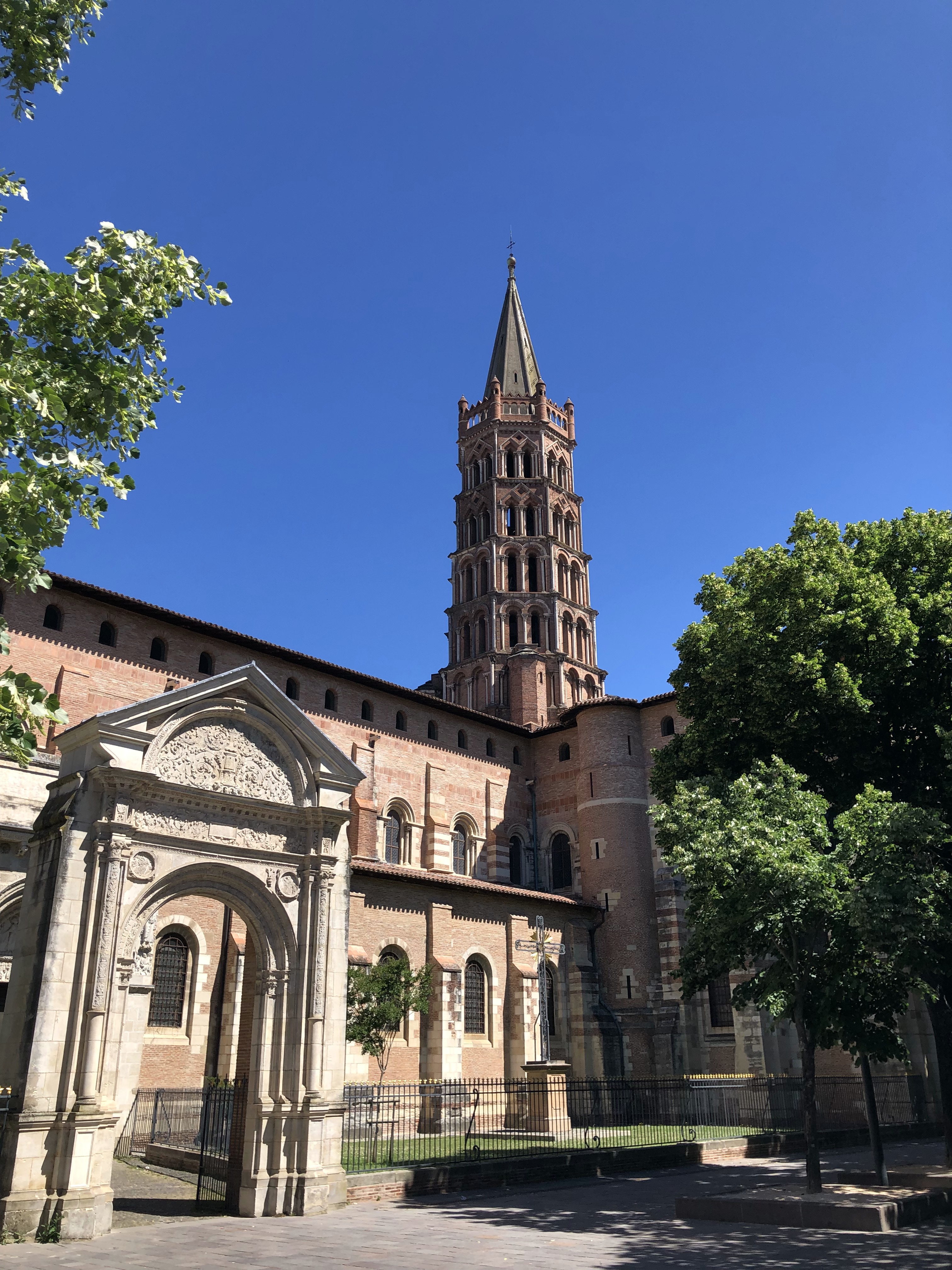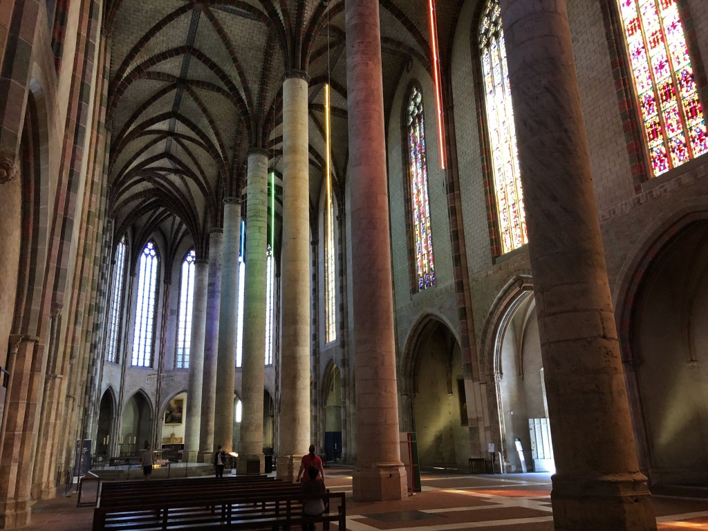 In de kerk van het nabijgelegen Couvent des Jacobins zoeken we na de lunch de koelte op. Het is een bakstenen gotisch gevaarte van 80 meter lang en bijna 30 meter hoog. De middenbeuk bestaat uit twee delen die gescheiden worden door enorme zuilen. De ribben van het gewelf lijken te vertrekken van de bovenkant van de kleurrijke zuilen waardoor ze op palmbladeren lijken.