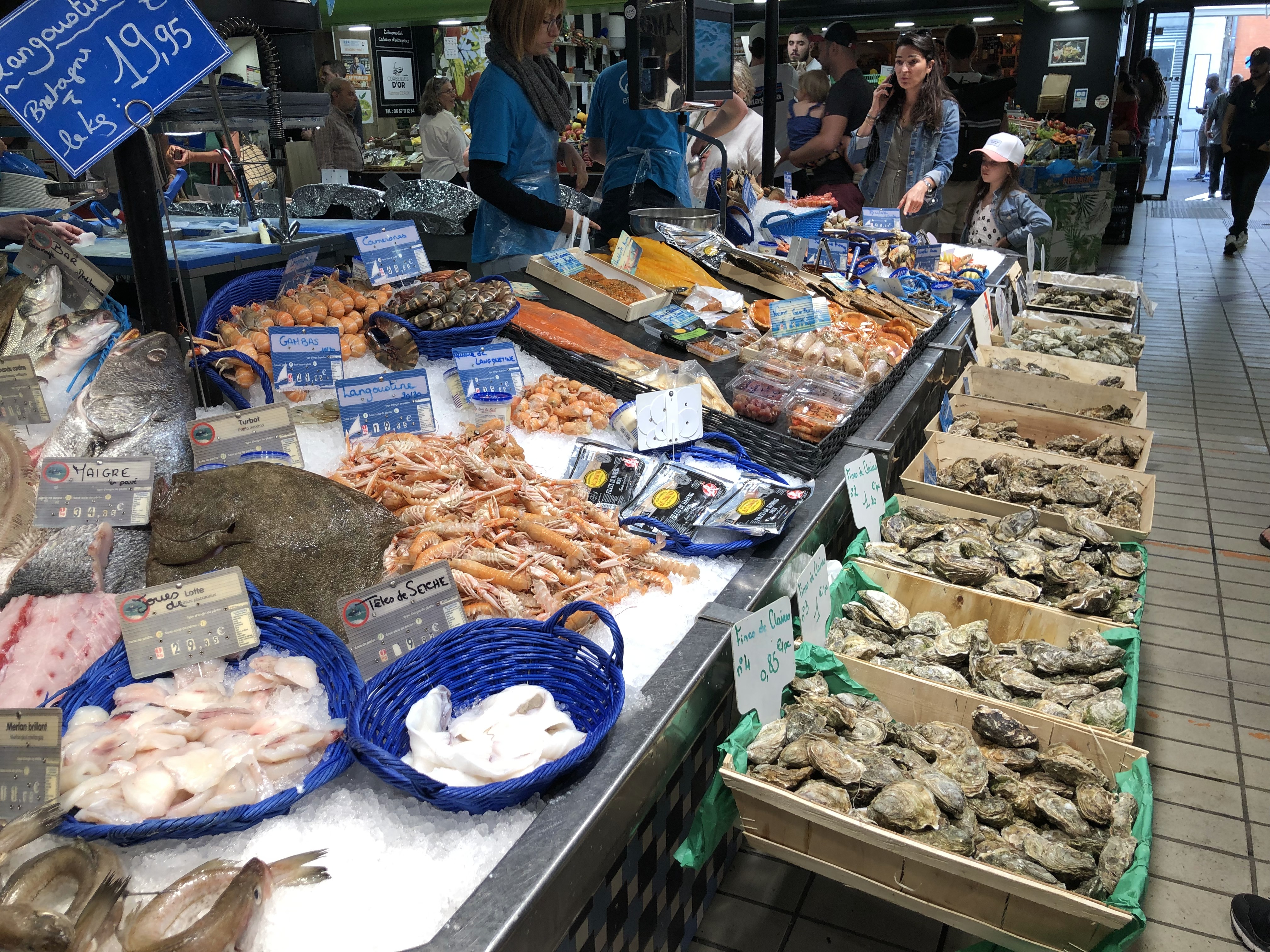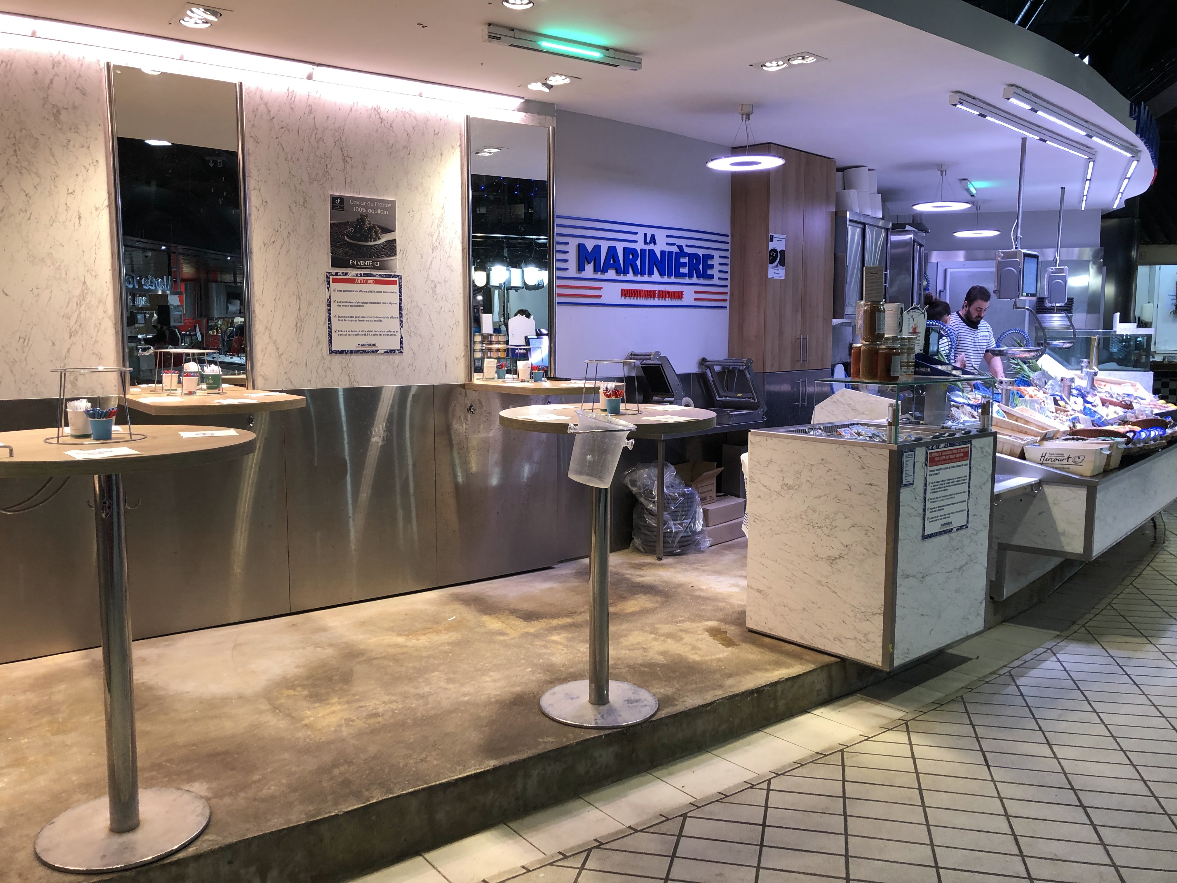 De voedingsmarkt mist gezelligheid. Niet dat de marktkramers geen moeite doen, want er staan tafeltjes genoeg waar je even kunt verpozen om een oestertje te sneukelen of een wijntje te proeven, maar ze staan er leeg en troosteloos bij. En dat is jammer, want de koeltogen liggen vol met dagverse producten van een kwaliteit die je nergens in de supermarkt vindt.