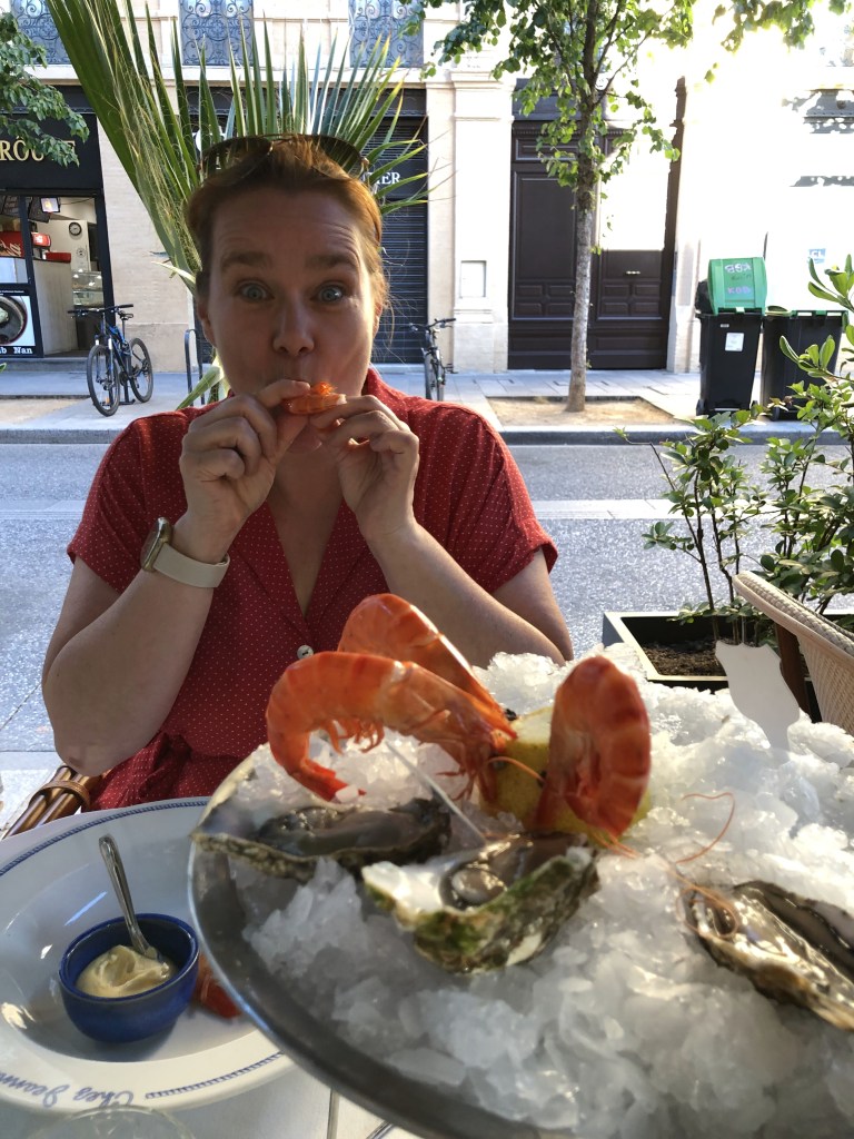 We laten het niet aan ons hart komen. De wijn is lekker, de oesters en de gamba’s ook.