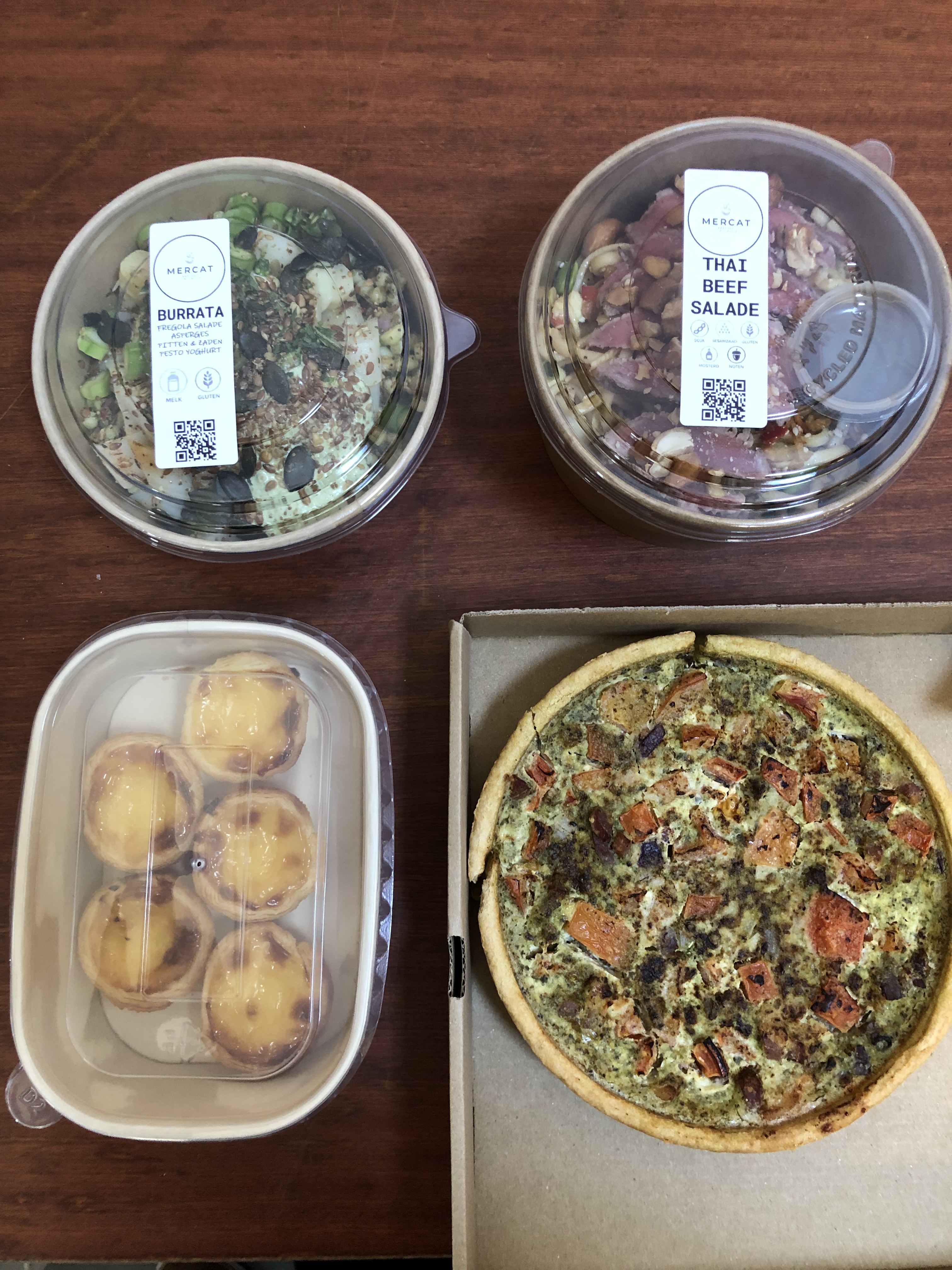 Omdat Belinda tot gisteren moest werken, bood ik aan me over de lunch te ontfermen. Dat gaat dankzij corona trouwens bijzonder makkelijk. Een van onze favoriete restaurants heeft sinds kort een kleiner broertje: Mercat. Je kunt er lunchen, maar Thari en Lawrence doen ook aan afhaal. Dat kan zowel ‘live’ in de zaak als in de ‘mercatomaat’, een automaat met superlekkere gerechten voor meerwaardezoekers die geen zin hebben in zelf kokkerellen. En heel wat gerechten kun je ook prima meenemen als je op reis gaat.