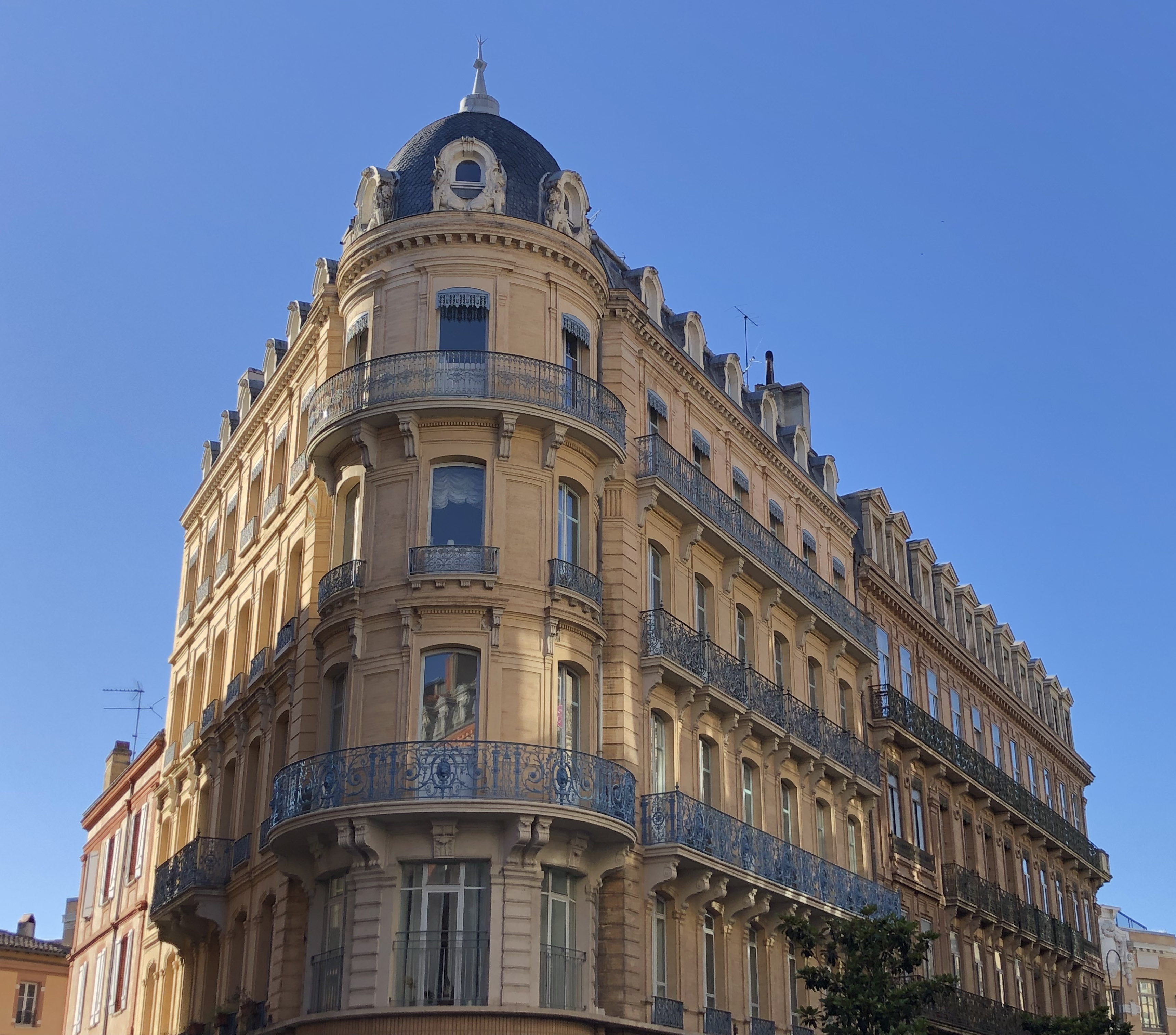 Toulouse is een architecturaal openluchtmuseum met goed onderhouden gebouwen uit alle mogelijke periodes. De oude herenhuizen met gietijzeren balustrades steken er wat mij betreft boven uit. We struinen door de stad op zoek naar een schaduwrijk terras, want de zon is stevig van de partij.