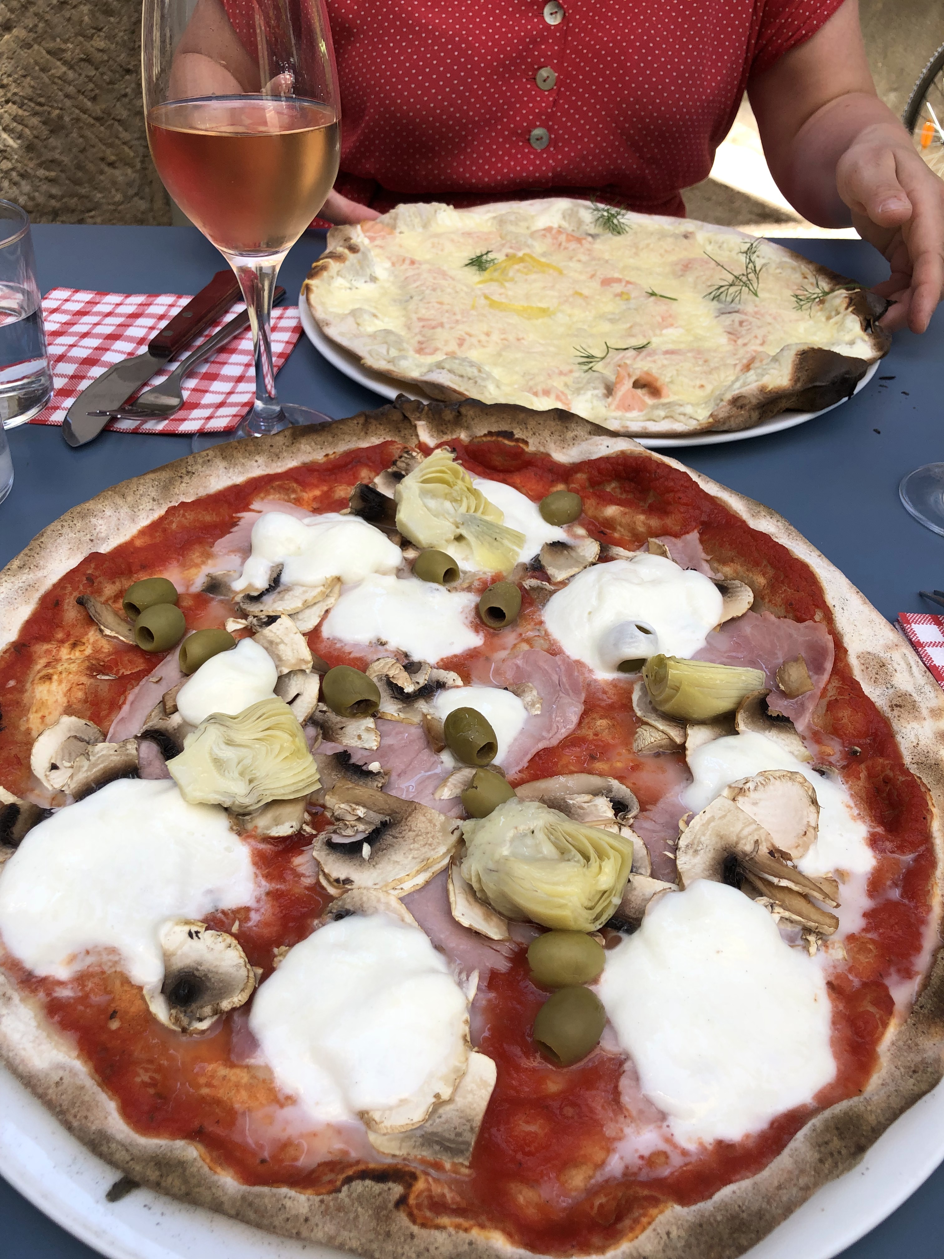 We zoeken een plekje om te eten en belanden na wat omzwervingen op het terras van Pizza e vino.