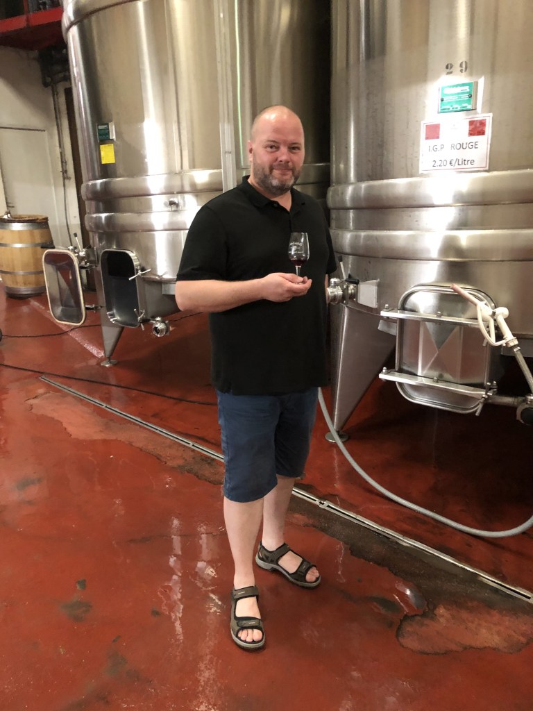 De wijnvertelster houdt mijn degustatieglas onder een kraantje van een van de grote citernes met betaalbaar godenvocht. Ik blijf het zalig vinden om zo wijn te proeven. Veel dichter bij het productieproces kom je niet.