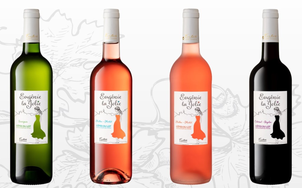 We starten met deze vlotte instappers van de Côtes du Lot die de naam ‘Eugénie la jolie’ kregen. Op het etiket staat de skyline van Albas met op de voorgrond een jongedame zonder kleedje. Niet dat alles zichtbaar is bij de deerne wat ze gekregen heeft van moeder natuur. Op de plaats van haar kleedje is het etiket uitgesneden. Door de groene flessen van de witte wijn, draagt ze op die manier een groen kleedje, bij de rosé een oranje kleedje en bij de rode een paars kleedje. Heel origineel en best trendy.