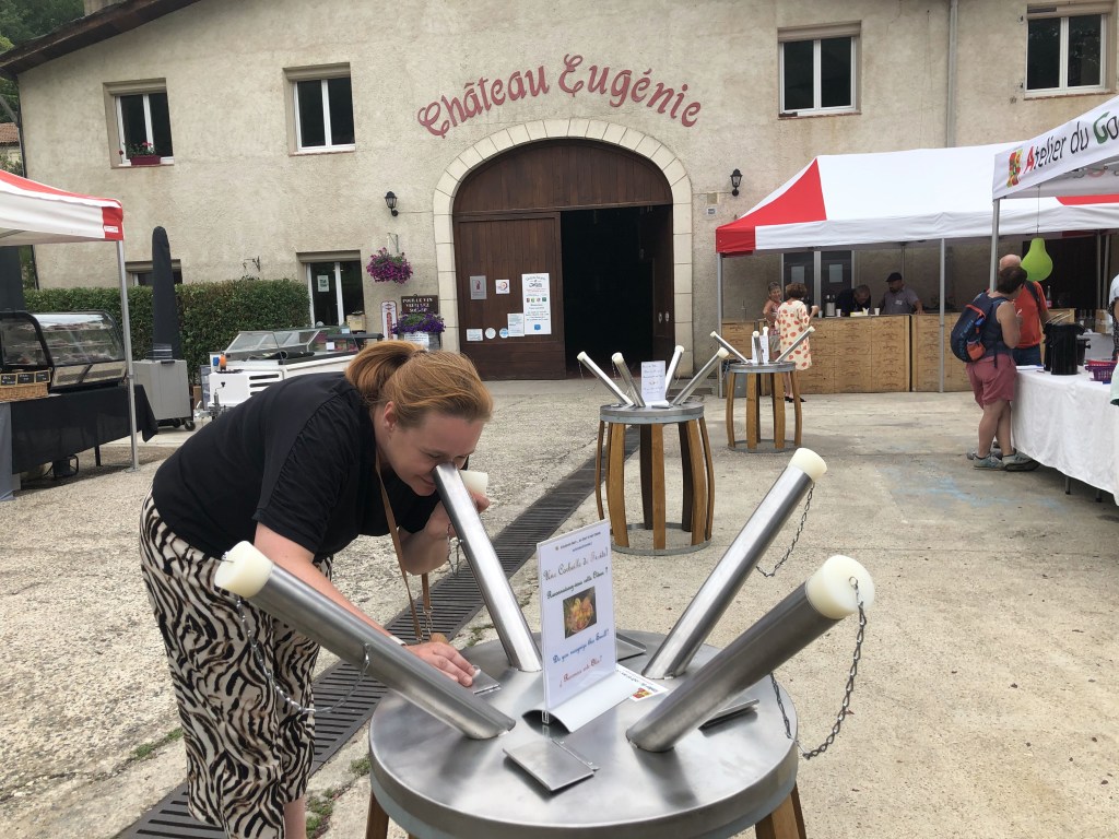 Terwijl op het podium een soundcheck plaatsvindt, zetten we een van de picknickbanken iets meer in de schaduw van de boomgaard van Château Eugénie.