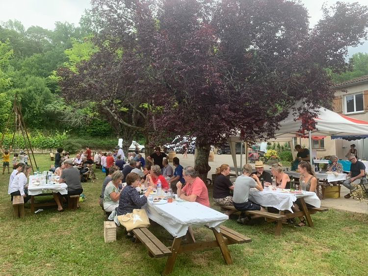 We lunchen vandaag bij Eugénie en zijn duidelijk niet alleen. Een bordje wijst ons naar een boomgaard waar we de auto kwijt kunnen. Op basis van de nummerplaten kunnen we ons alvast een beeld vormen van wie er straks samen met ons gaat picknicken: mensen uit de buurt (te herkennen aan het departementsnummer 47 op de nummerplaat), maar ook verschillende buitenlandse bezoekers die (nog) niet in de regio wonen.