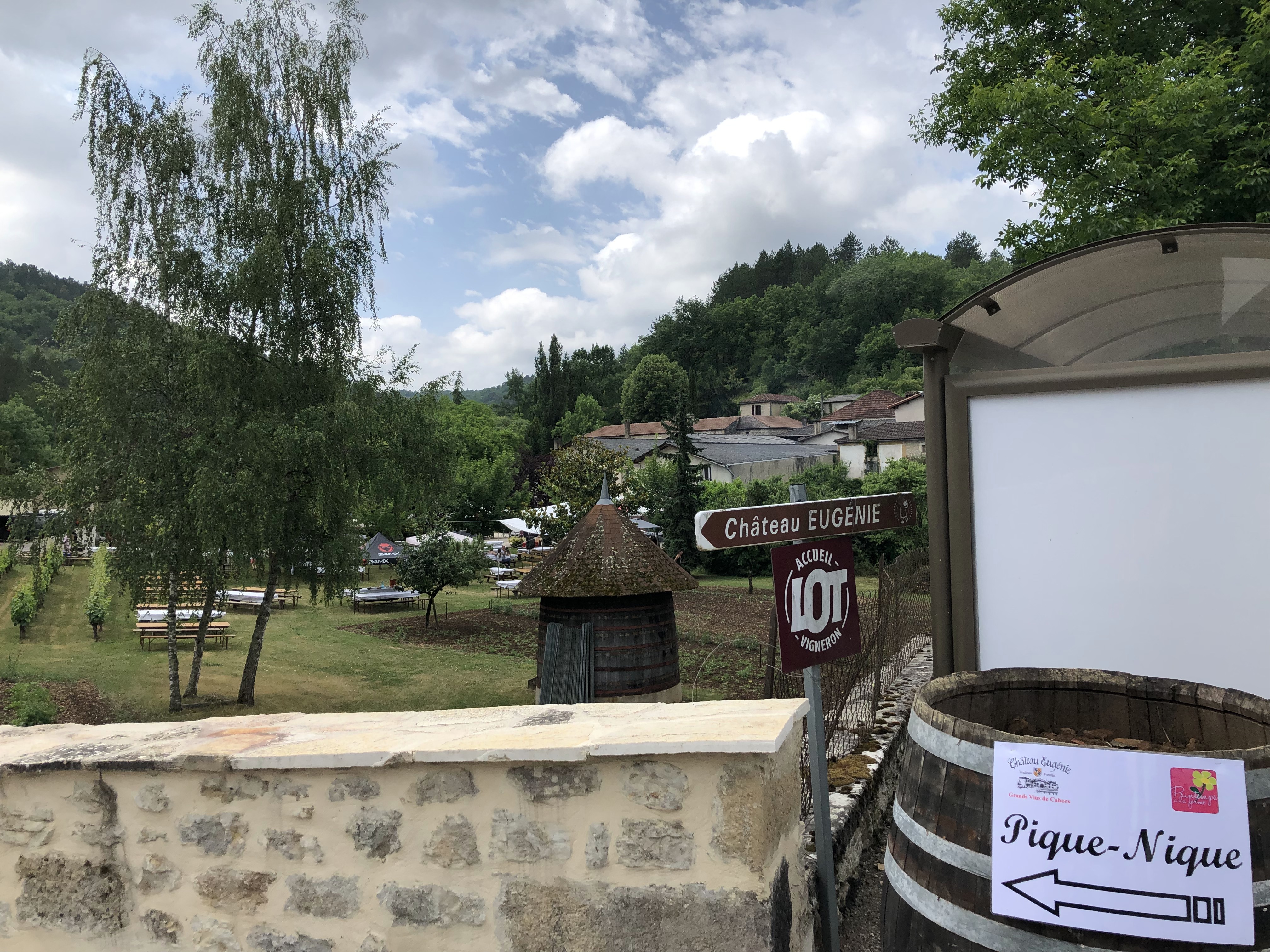 We lunchen vandaag bij Eugénie en zijn duidelijk niet alleen. Een bordje wijst ons naar een boomgaard waar we de auto kwijt kunnen. Op basis van de nummerplaten kunnen we ons alvast een beeld vormen van wie er straks samen met ons gaat picknicken: mensen uit de buurt (te herkennen aan het departementsnummer 47 op de nummerplaat), maar ook verschillende buitenlandse bezoekers die (nog) niet in de regio wonen.