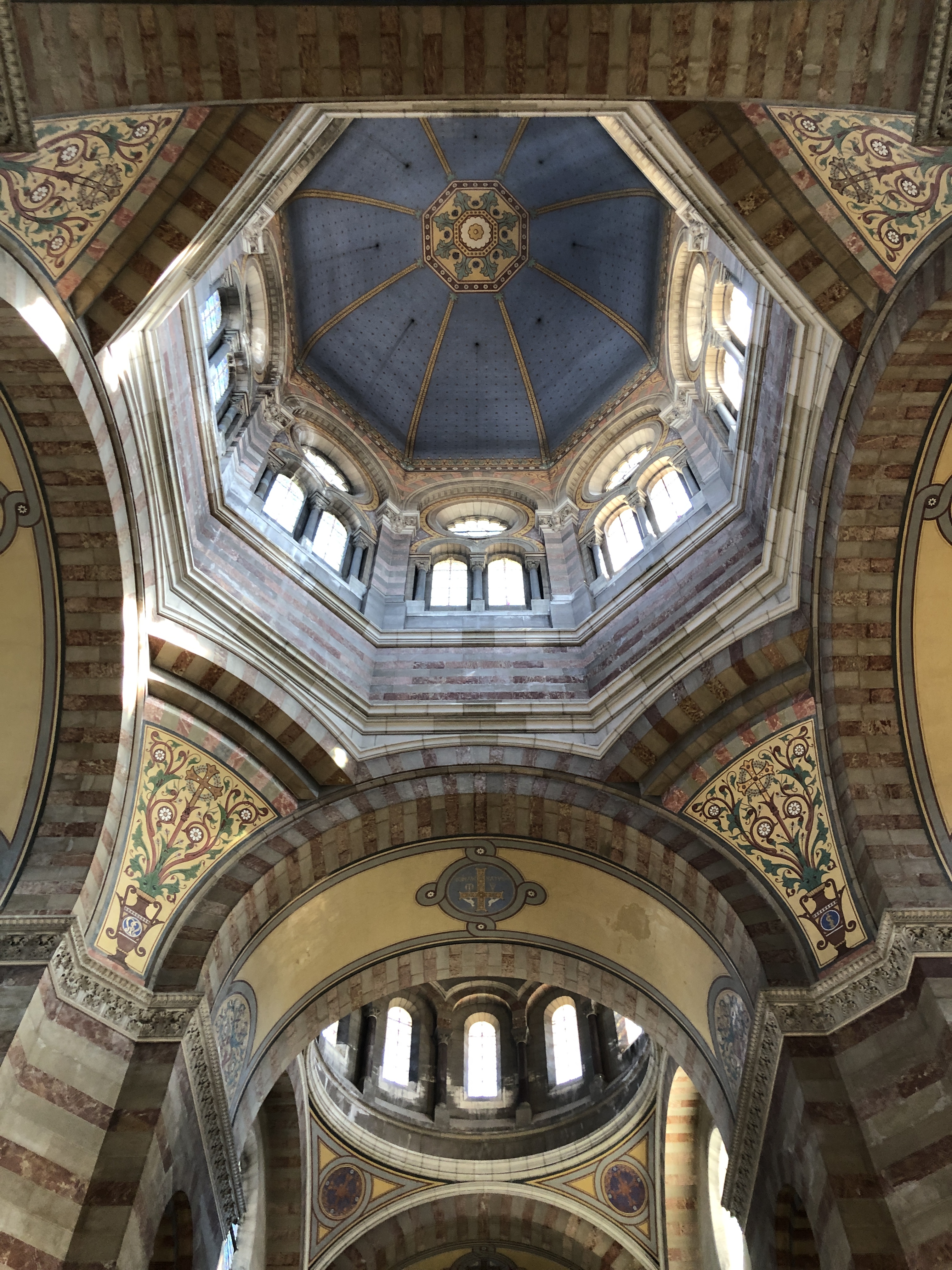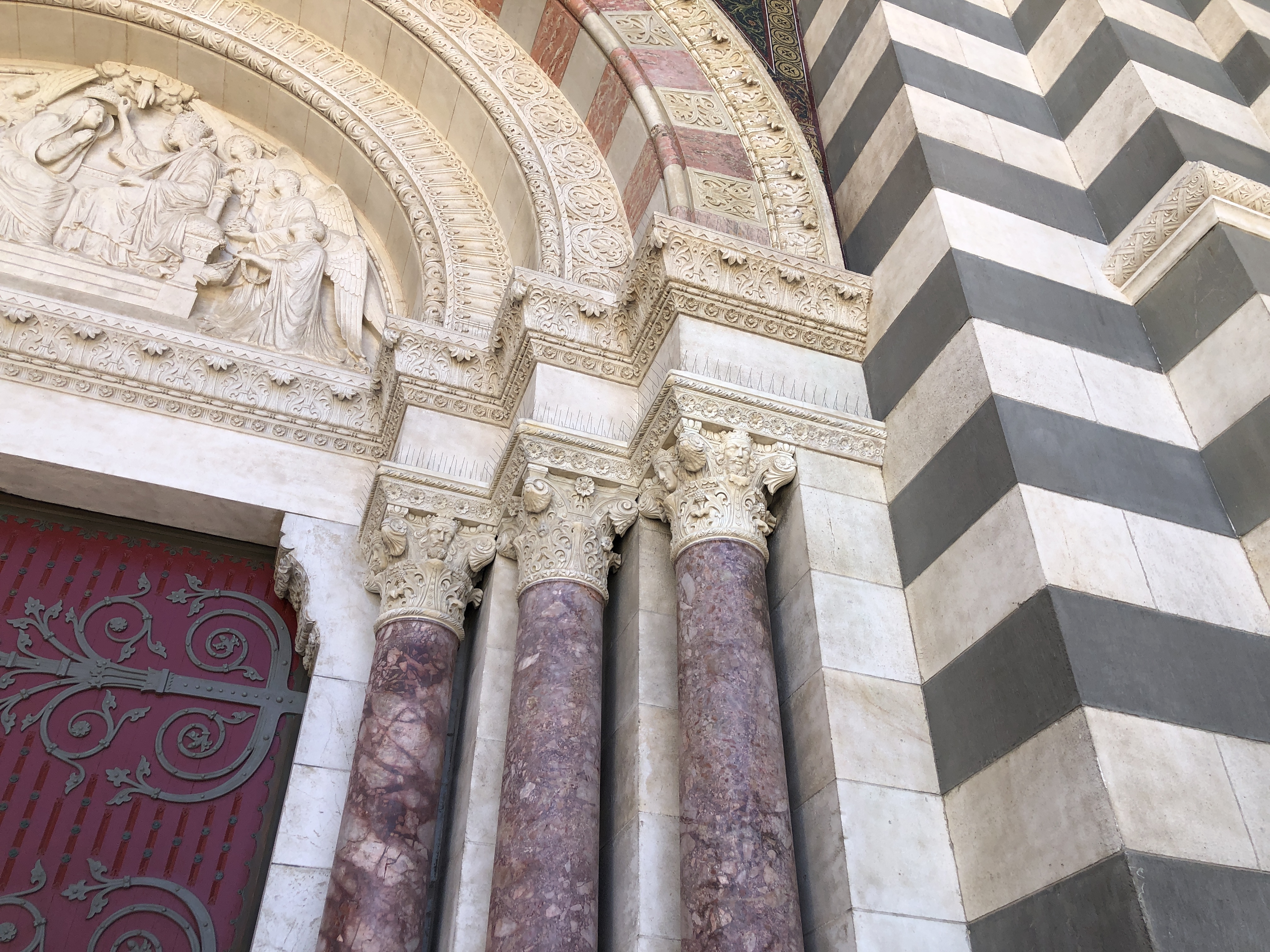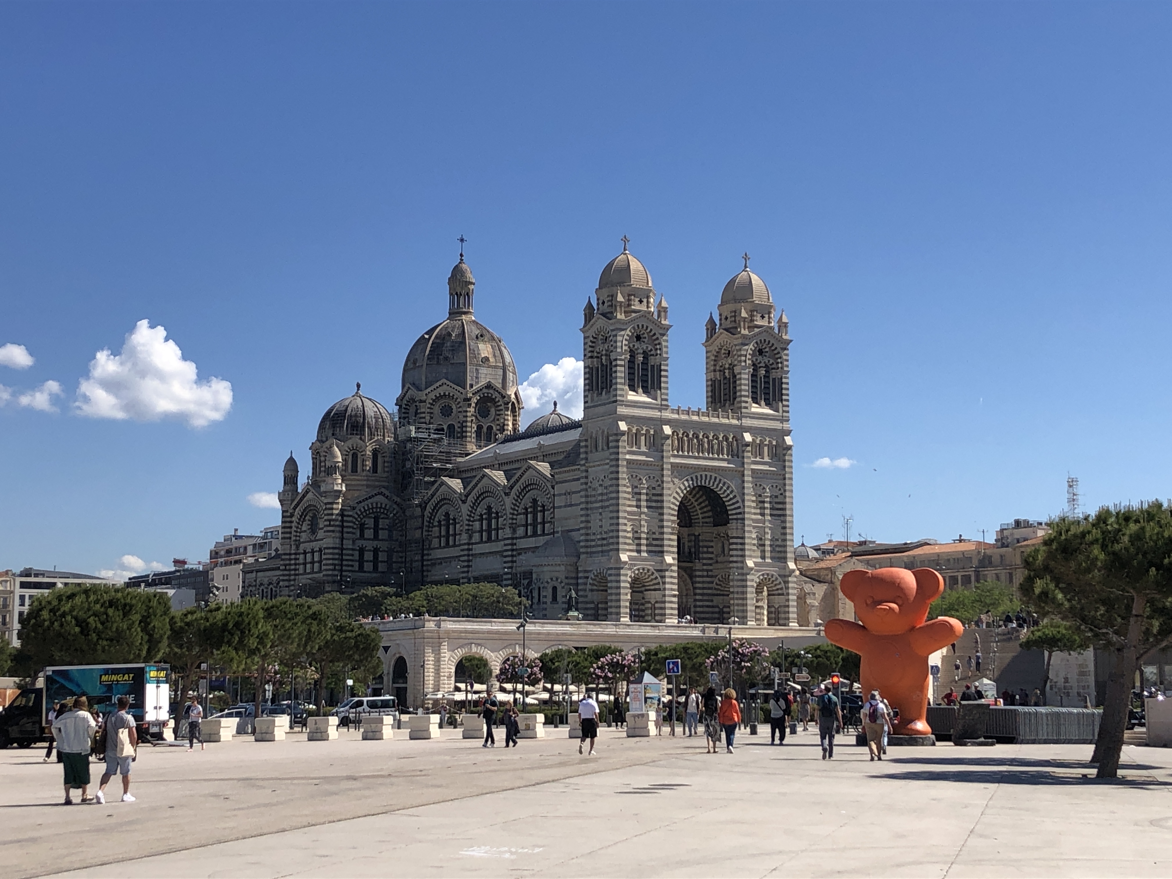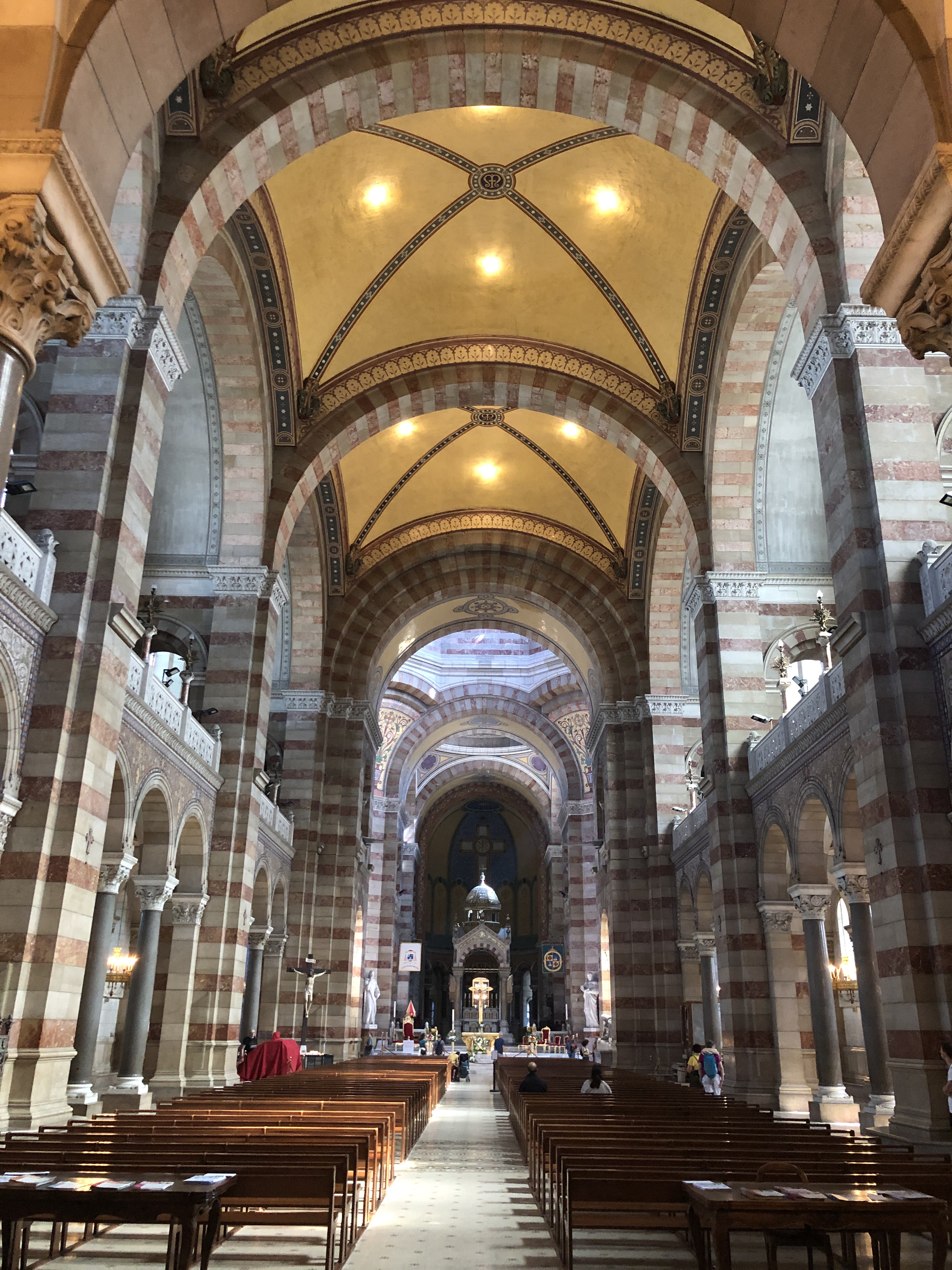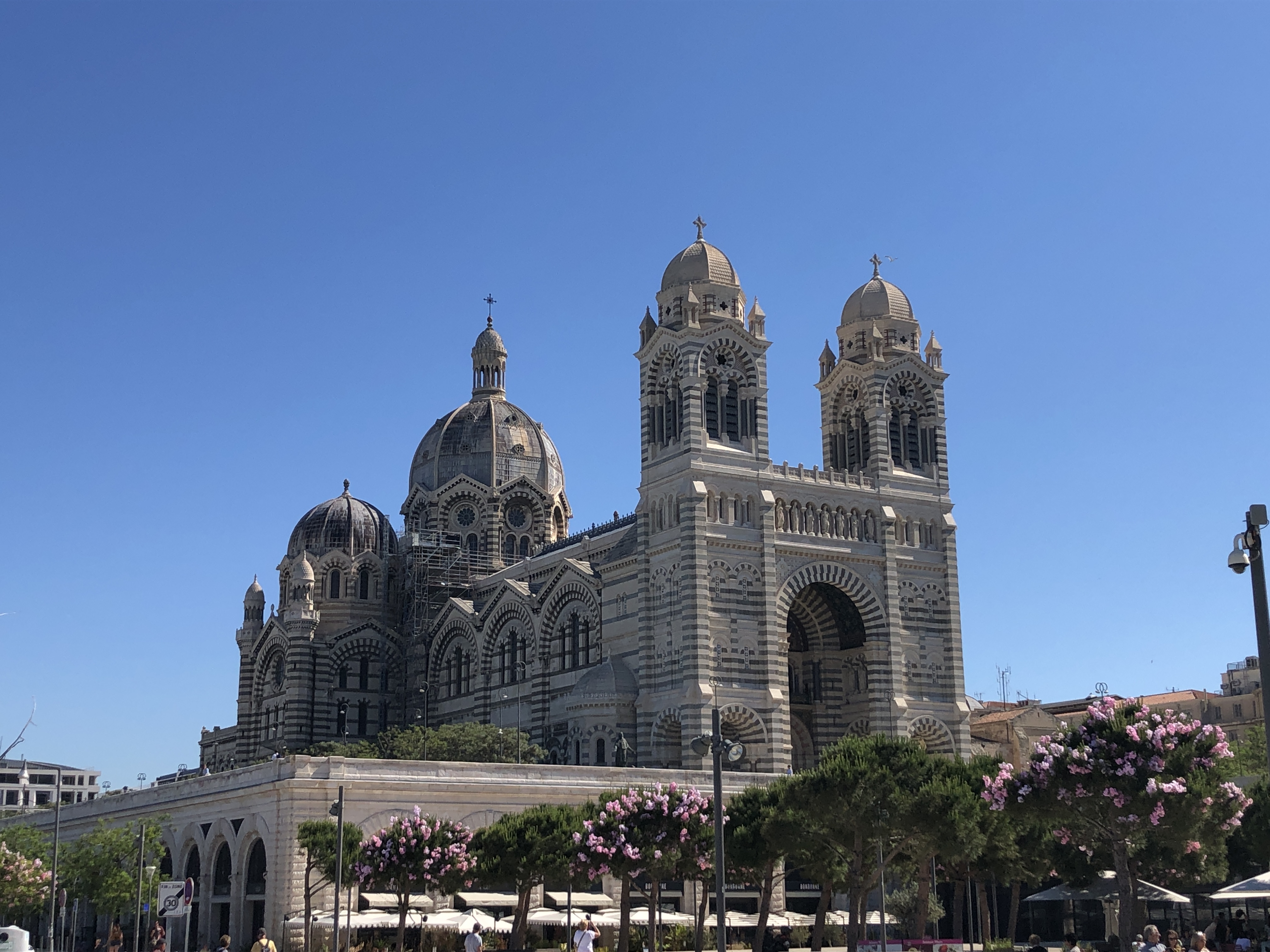 Onze wandeltocht door de stad start aan de voet van La Major, een van de grootste kathedralen van Frankrijk. Ze is maar liefst 142 meter lang en heeft een enorme koepel van 18 meter doorsnede. De Byzantijnse look verraadt de relatie met het oosten die Marseille nog steeds heeft. We zitten op een boogscheut van Italië en ook dat merk je: aan de buitengevel wisselen de lagen marmer uit Carrara en groene steen uit Firenze elkaar af en de volledige vloer van de kathedraal is bedekt met miljoenen mozaïeksteentjes uit Venetië die je meer naar beneden doen kijken dan naar boven.