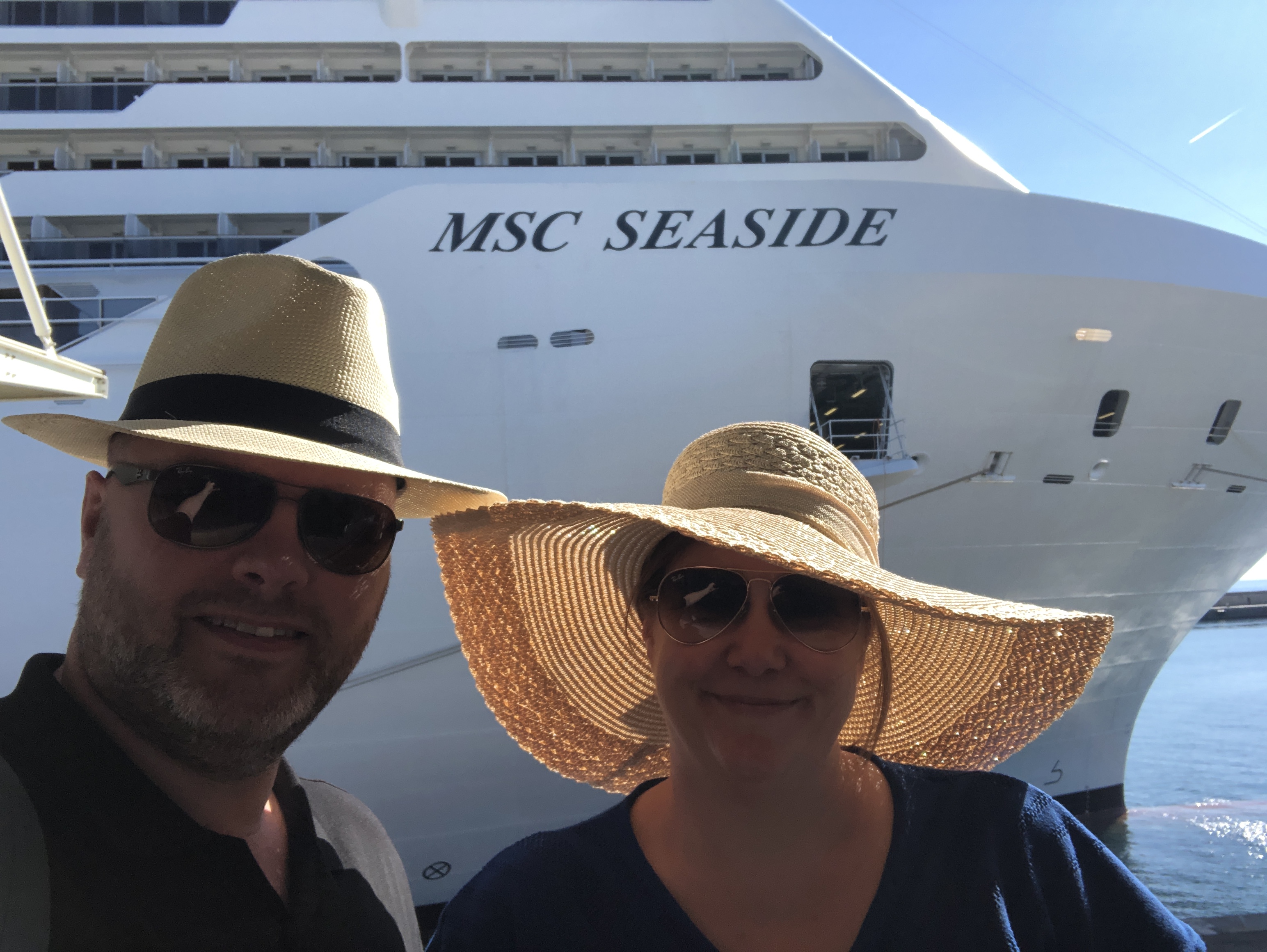 Van de oude haven zetten we koers naar de nieuwe haven waar de MSC Seaside op ons ligt te wachten. Voor wie zich een beeld wil vormen van het gevaarte waar we de komende week mee op pad gaan. Het schip is met zijn lengte van 323 meter bijna even lang als de Eiffeltoren, tenminste als je de antenne van de Eiffeltoren meetelt. Het is 41 meter breed en 75 meter hoog, goed voor 18 verdiepingen. Er kunnen 5084 passagiers mee, die in de watten gelegd worden door 1513 bemanningsleden. 6597 man aan boord dus, een klein derde van het inwonersaantal van de gemeente Zoersel.