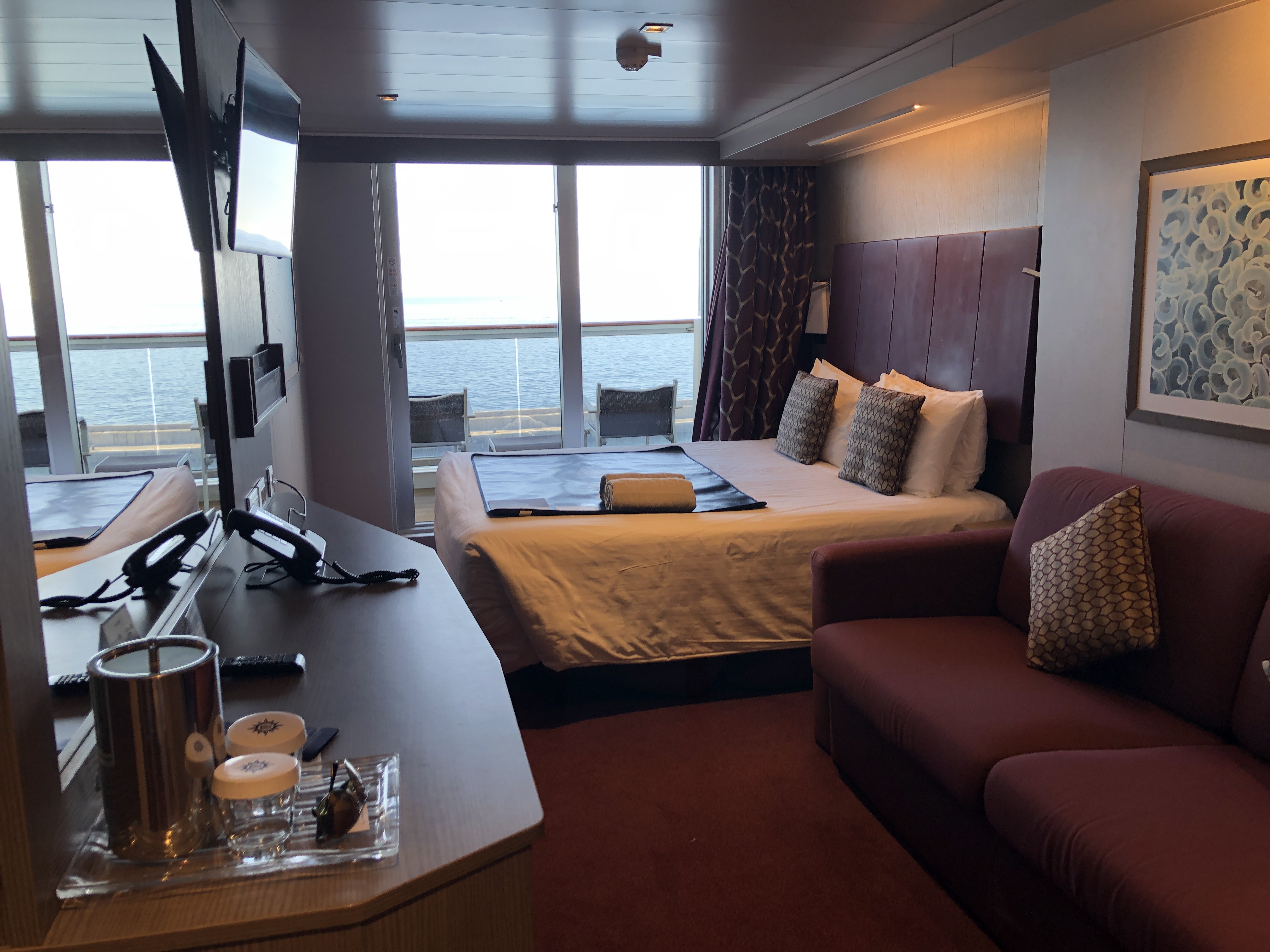 Ook de onboarding verloopt vlot. In minder dan 10 minuten zijn we ingecheckt en langs de security gepasseerd. Onze koffers laten we achter en zullen we straks aan de deur van onze kajuit terugvinden. Aan de deurklink hangen nu al onze cruisecards die niet alleen als kamersleutel dienst doen, maar ook gebruikt worden als betaalkaart voor drankjes en andere aankopen aan boord. Reeds bij mijn eerste cruise, begin jaren 2000, gebeurde het al zo. Destijds kon je op de tv in je kajuit je uitgavegedrag raadplegen op een soort van teletekst. Ondertussen gebeurt dit uiteraard met een app op je telefoon. Al zal er deze week niet veel uitgegeven worden. We hebben gekozen voor het Easy Plus Drankenpakket. Daarmee kun je alle dranken tot 9 euro per glas bestellen.