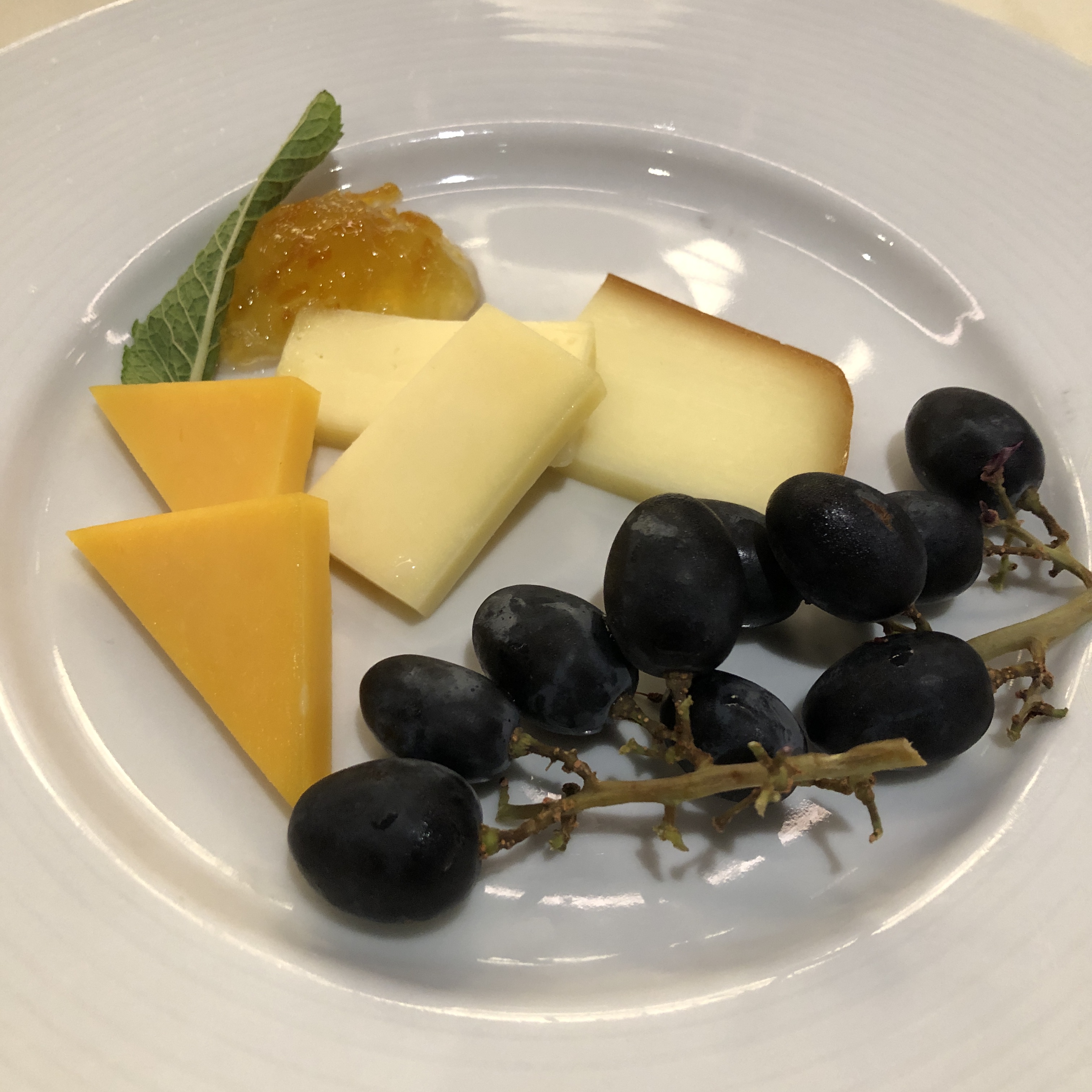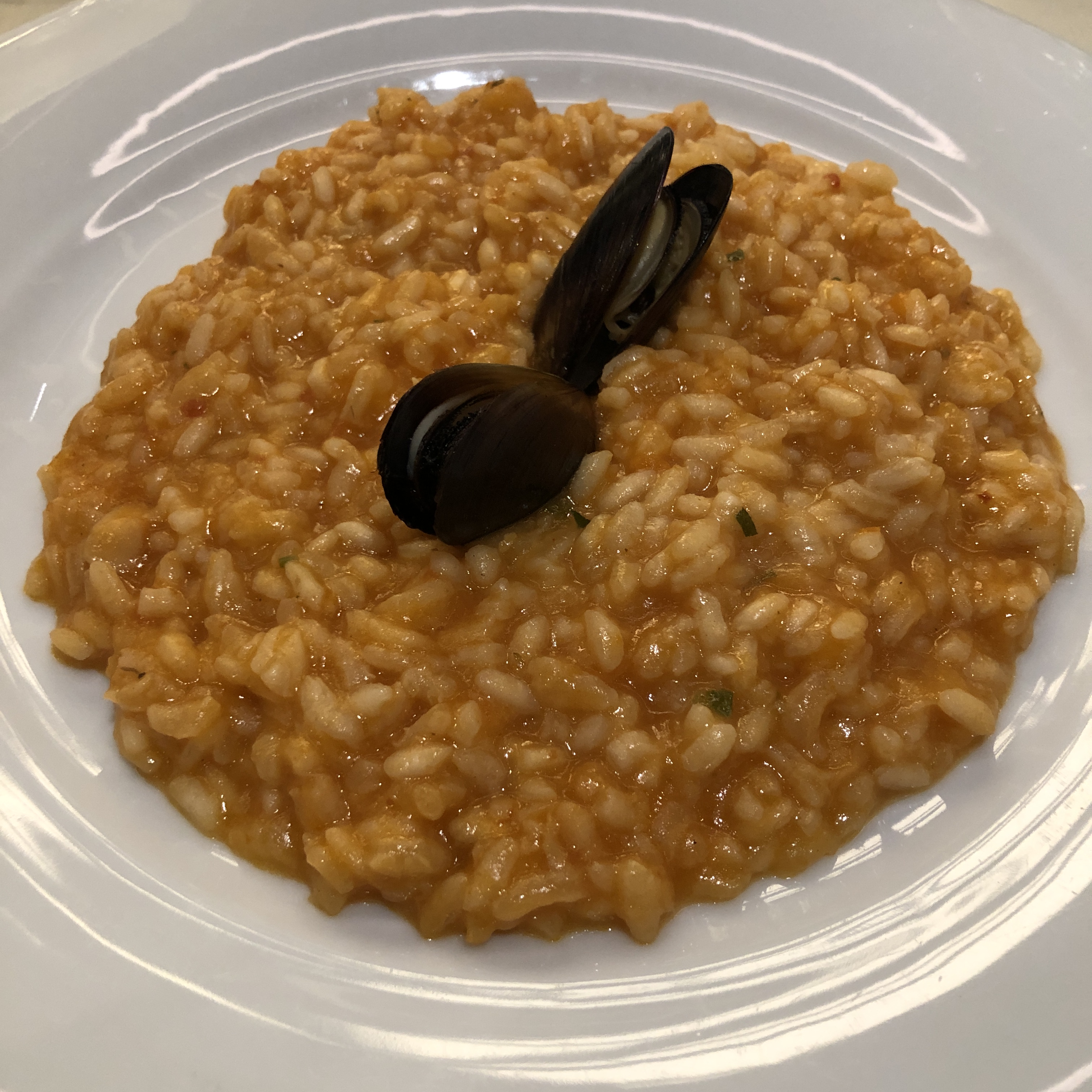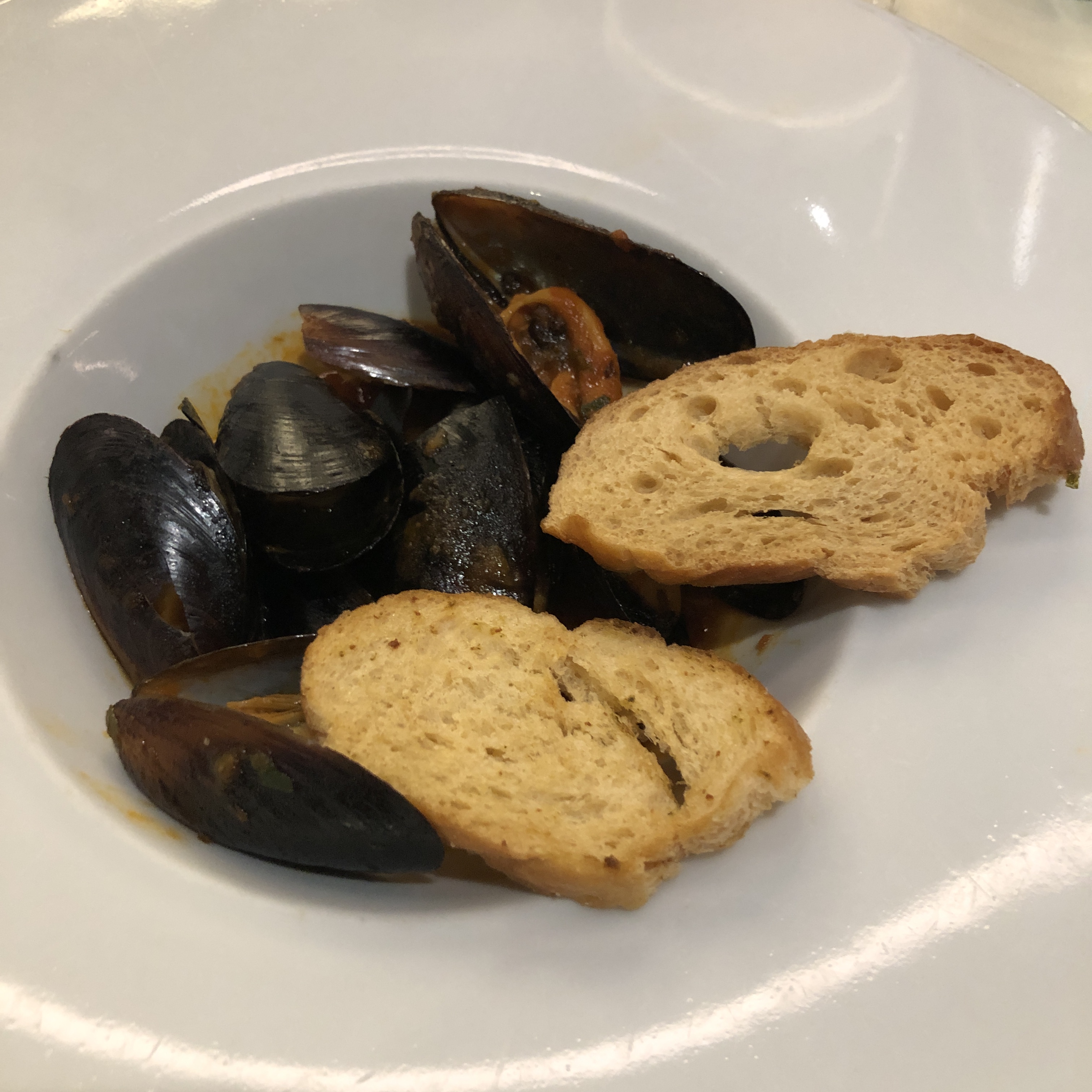 Dat scannen lukt ons best en werkt bijzonder gemakkelijk. Ik ga voor de mosselen, de risotto met zeevruchten en een kaasbordje om af te sluiten. Bij elke gang bestellen we een andere wijn.