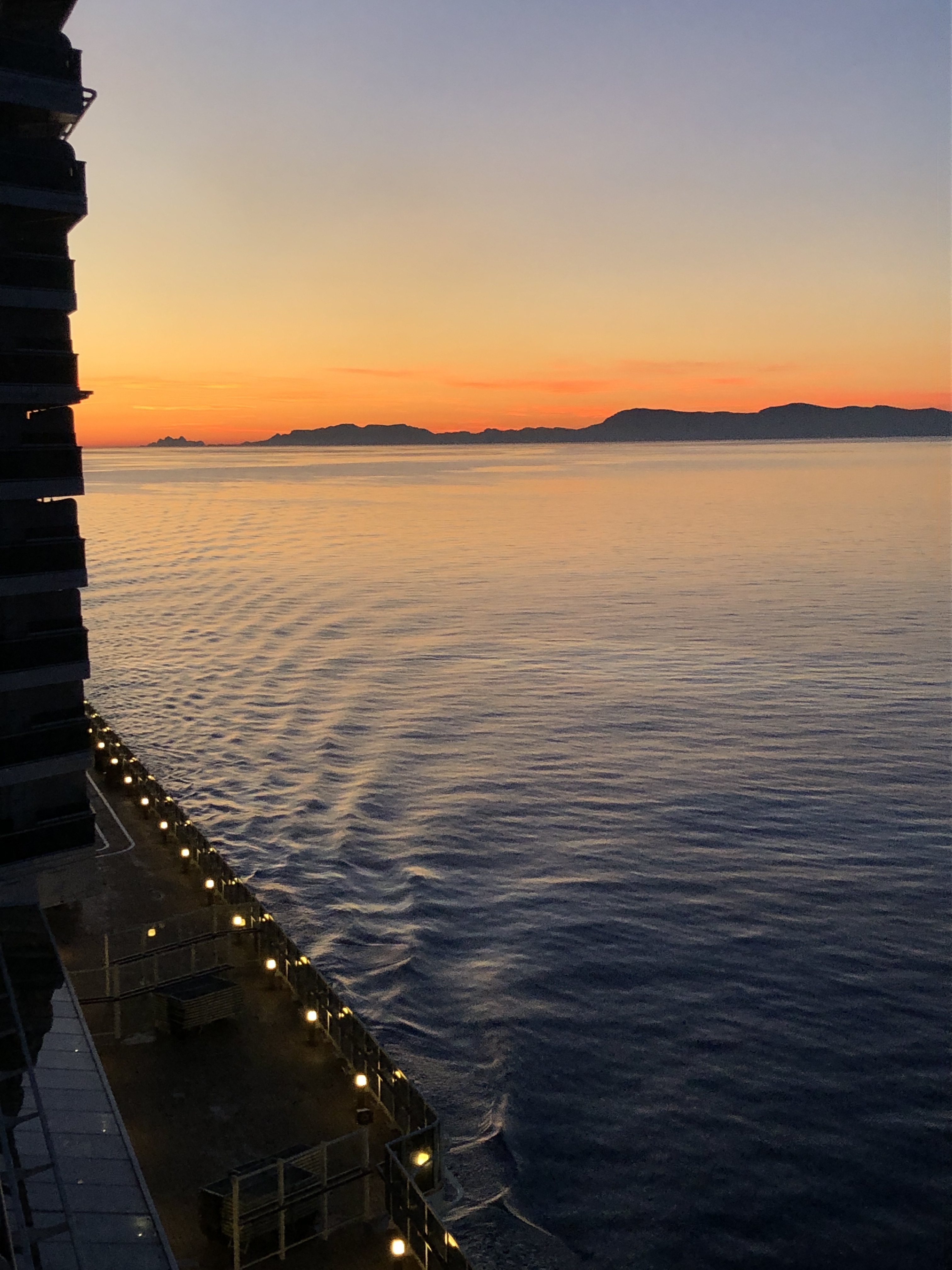 Moe, maar meer dan voldaan trekken we ons terug op ons eigen plekje op het majestueuze schip. Voor de eerste keer heb ik een buitenkajuit geboekt, eentje met terras. En dat is echt een meerwaarde. Vanop ons balkon zien we de zon onder gaan met een spectaculaire kleurenpracht boven de Zuid-Franse kustlijn.