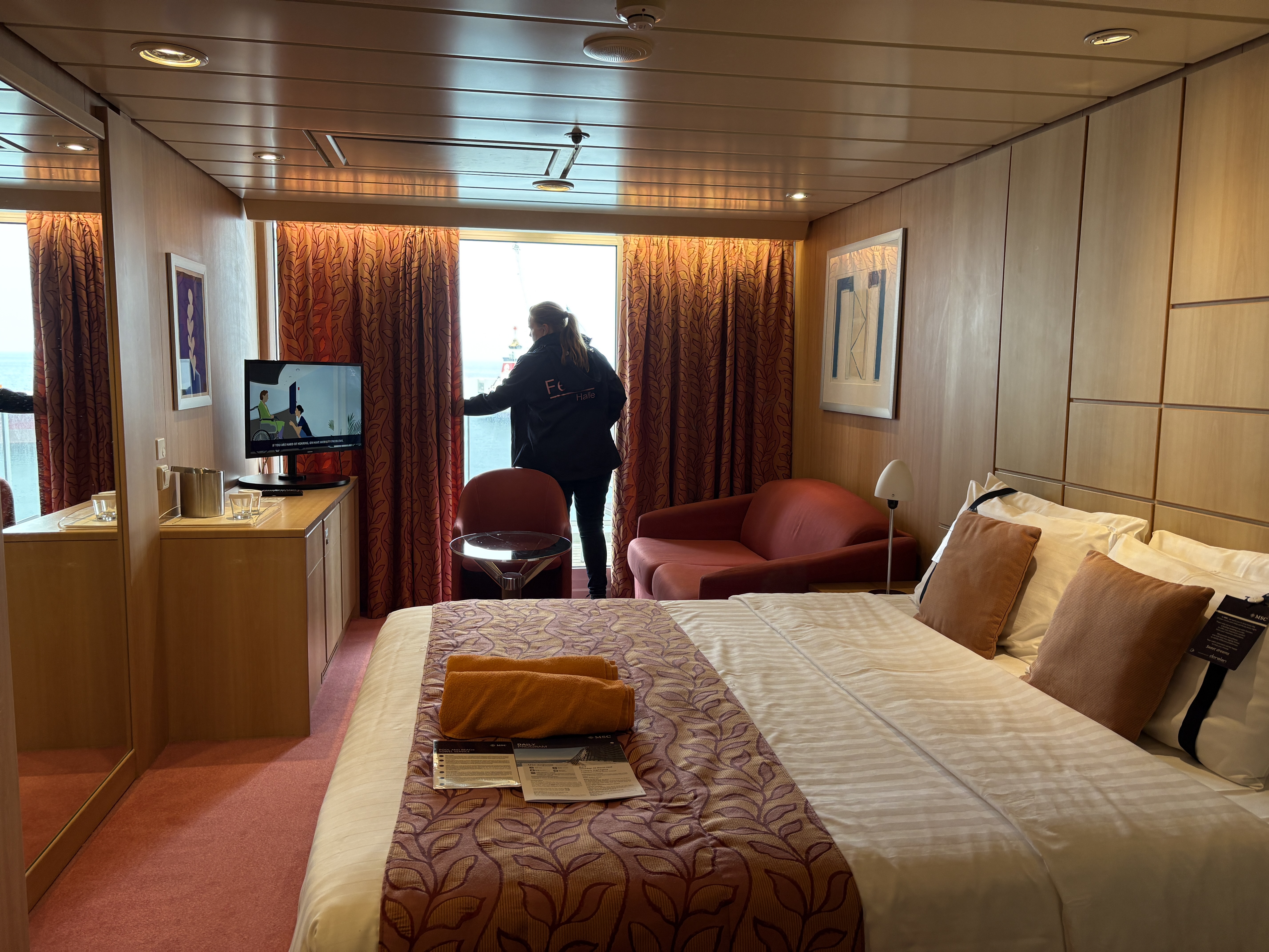 Ondertussen kennen we de gebruiken. Na de veiligheidscontrole kunnen we direct door naar onze kamer waar we onze spullen achterlaten. De koffers worden later deze middag tot aan de kajuit gebracht. Onze sleutelkaartjes hangen al aan de deur.