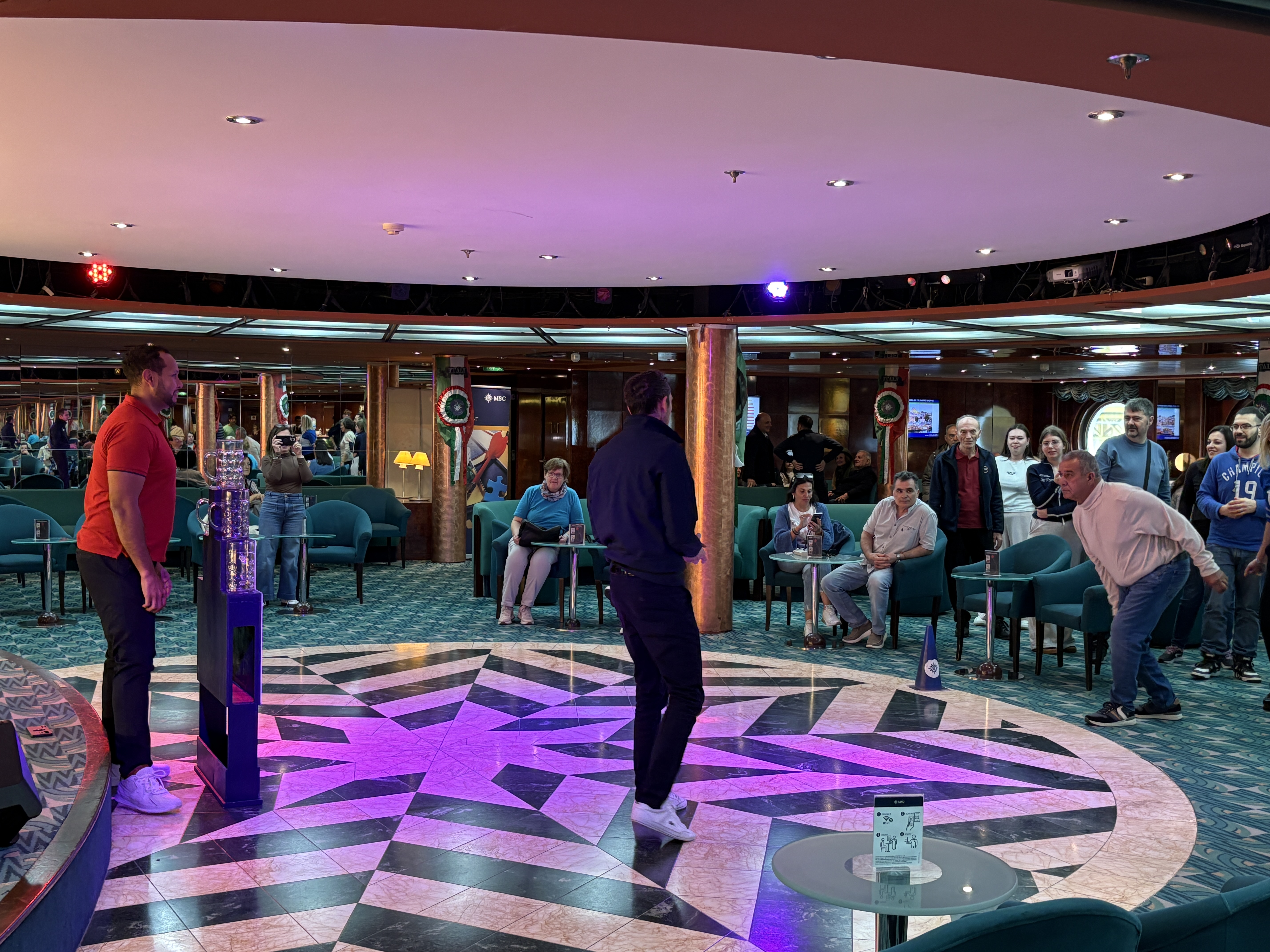 In tegenstelling tot de MSC Seaside waar we vorig jaar de westelijke Middellandse Zee mee aandeden, is de Sinfonia een relatief klein schip. En dan werd het in 2015 bij een zeer grondige renovatie nog een stuk verlengd door in het midden een compleet nieuw gedeelte toe te voegen, zodat de uit de kluiten gewassen sloep nu zo’n 275 meter lang is en plaats biedt aan een kleine 2000 passagiers en 700 crewleden. Toch valt ze in het niets bij een mastodont als de Seaside die je met zijn 7 extra verdiepingen van aan de andere kant van een stad kon zien liggen in de haven. Handig, wanneer je even de weg kwijt bent.