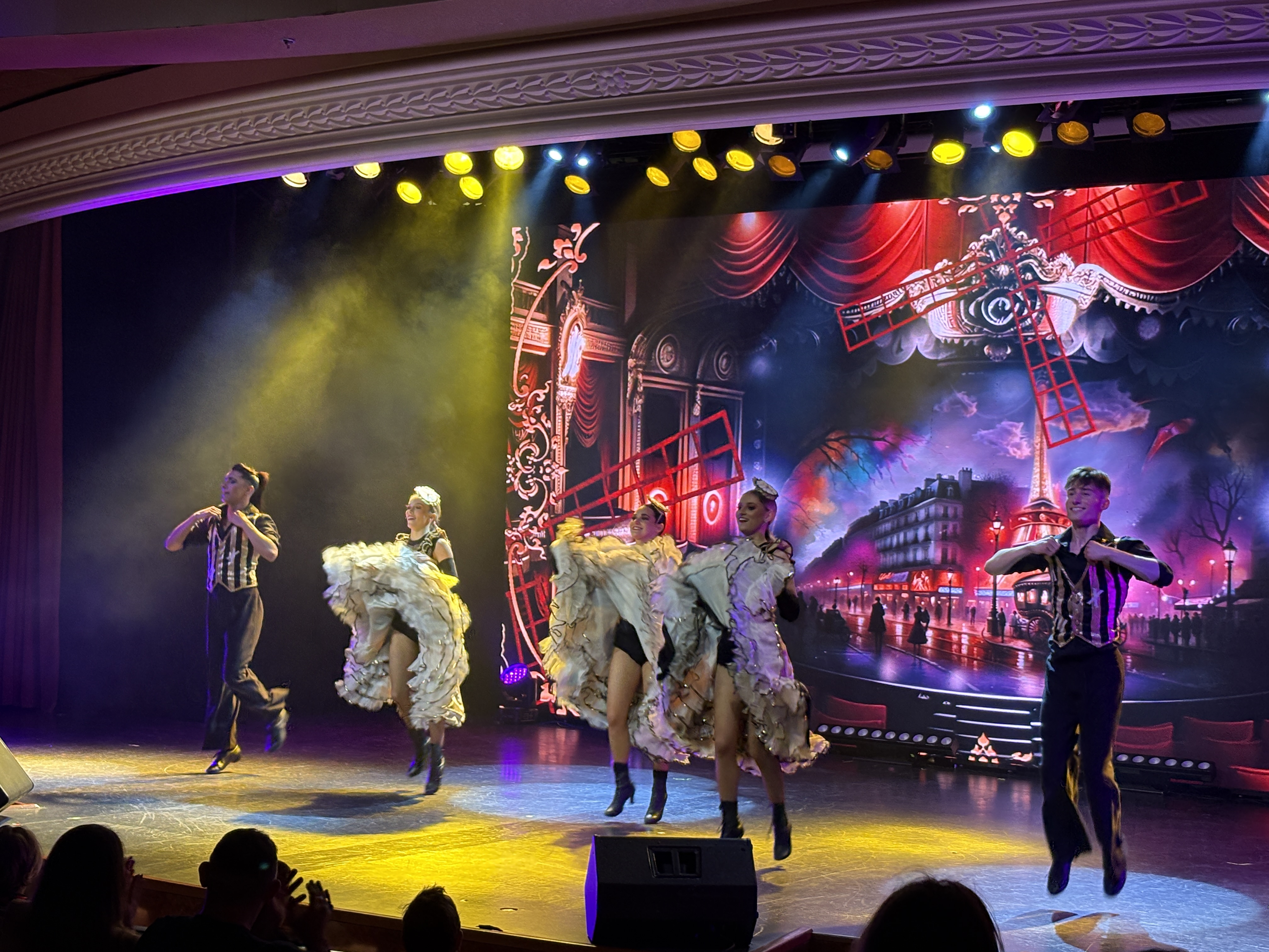 Het theater, iets groter dan de Arenberg, heeft net als het Witte Paard een enorme videowall. De tijd van de bordkartonnen decors is duidelijk voorbij, ook op zee. De show die zich voor de flitsende muur met AI-animaties afspeelt, moet niet onderdoen voor zijn Blankenbergse tegenhanger. Zelfs de leadzangeres heeft veel weg van Sandrine, zowel vocaal als qua uiterlijk.