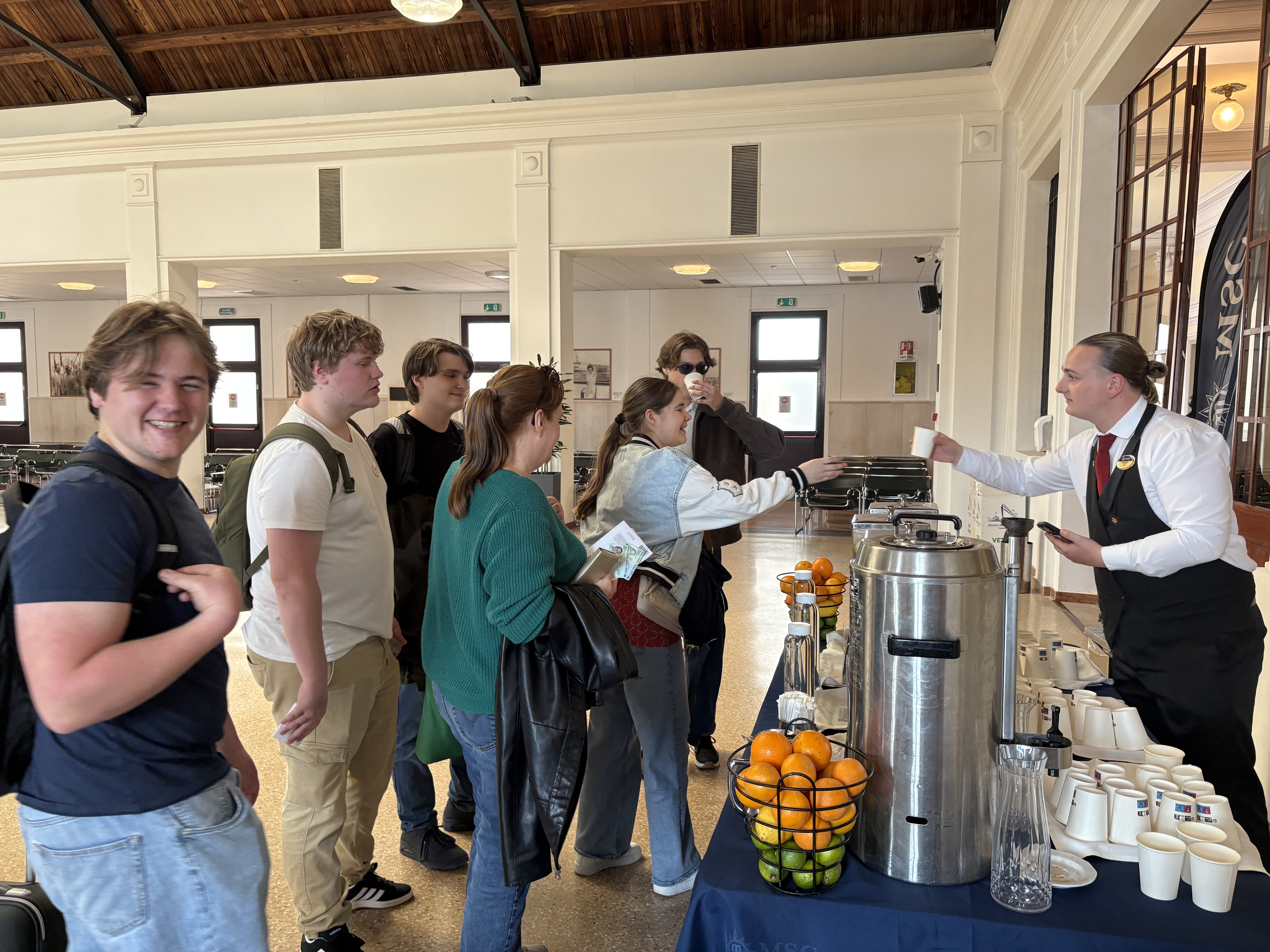 We raken aan de praat. Hij blijkt na zijn studies te zijn blijven plakken in Leuven. Daar heeft hij een studio gekocht, die ondertussen door vrienden wordt gehuurd en dus wordt afbetaald terwijl hij zelf op cruises werkt. Overdag staat hij hier als ober, maar daarnaast is hij ook muziekingenieur en festivalmuzikant. Af en toe staat hij zelf ook op het podium aan boord van verschillende cruisebedrijven.