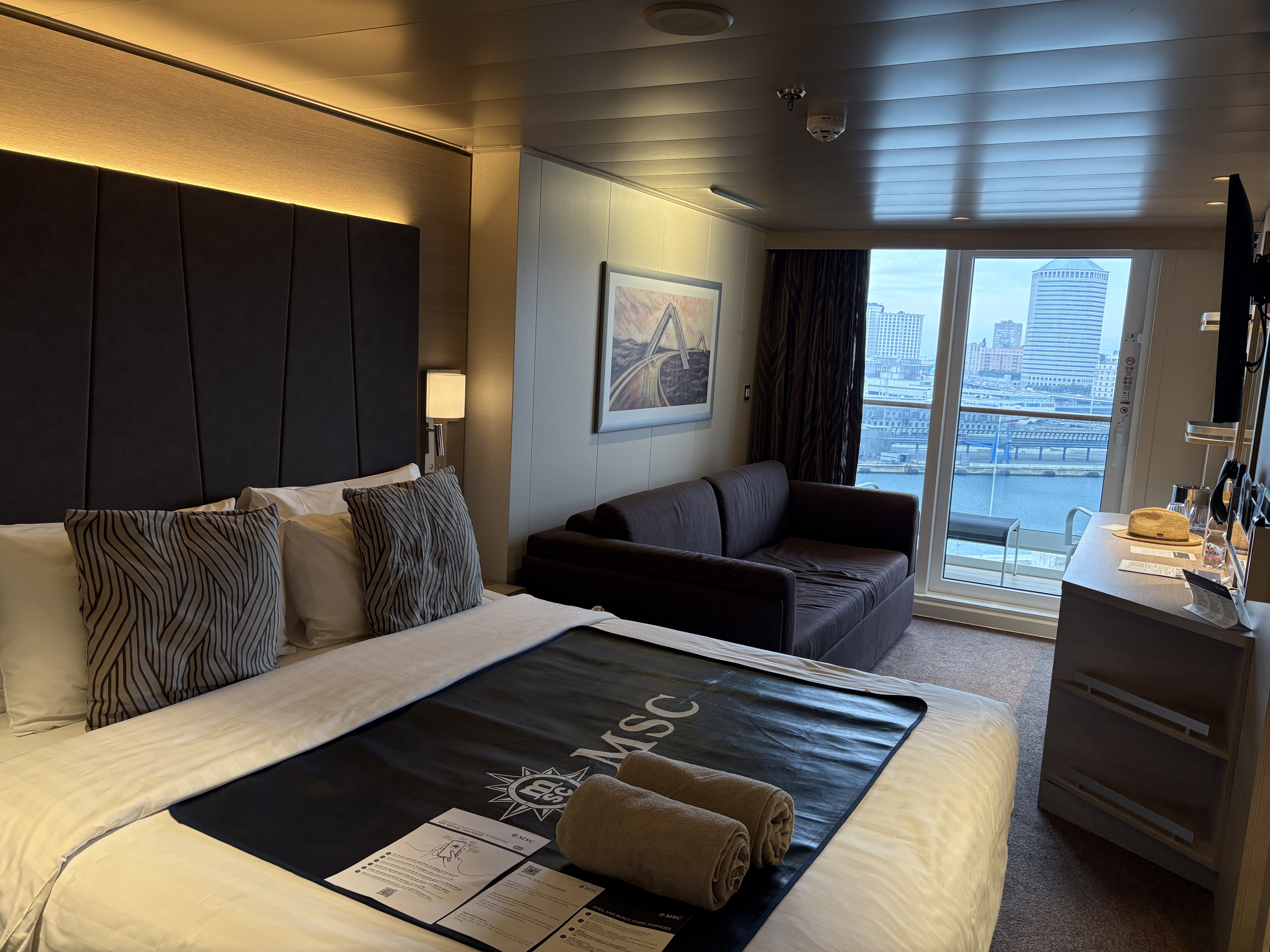 De boarding verloopt dan weer verrassend vlot. We moeten niet meer verzamelen in het theater voor de safetydrill zoals vroeger, maar gewoon even aanmelden in de MSC-app en een veiligheidsfilmpje online bekijken. We zetten het filmpje op… terwijl we onze eerste cocktail drinken op het dek. Op dat moment maken we ook een eigen groepje aan in de app. Die heeft ondertussen namelijk ook een eigen berichtenservice zodat we elkaar berichten kunnen sturen via de wifi van het schip.