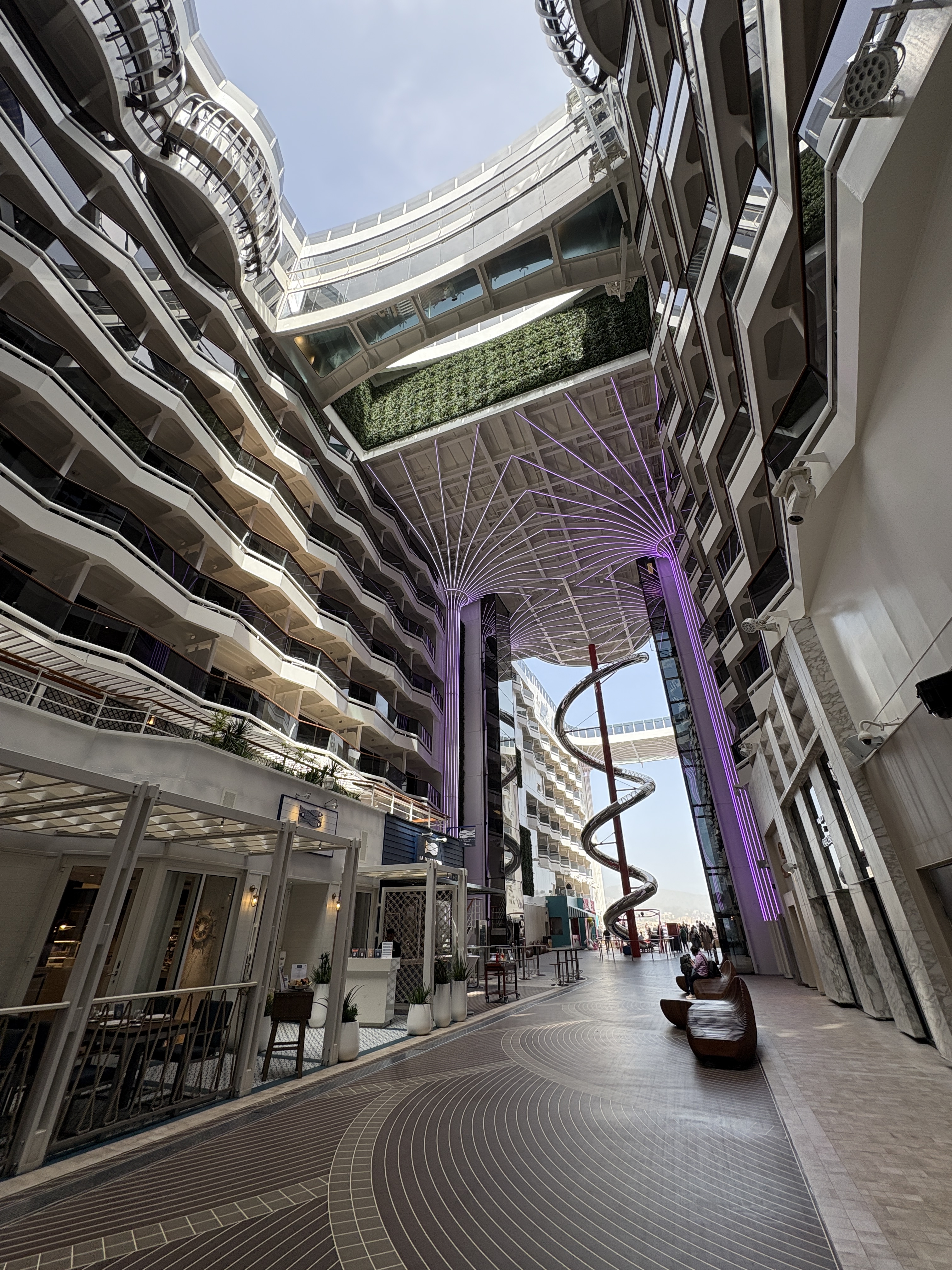 Achteraan opent die promenade zich spectaculair over meerdere verdiepingen in open lucht. Daar ligt de “World Promenade”, met terrassen en restaurants. Je zit er met zicht op zee, aan de binnenkant van het schip. Indrukwekkend en licht absurd tegelijk.