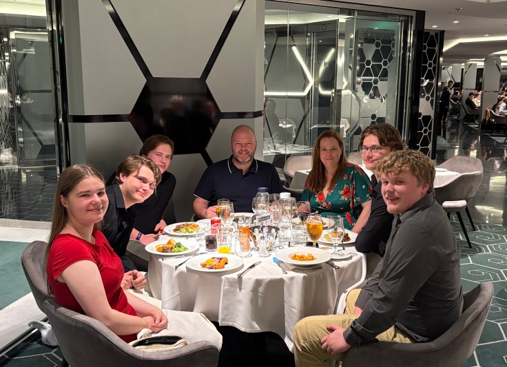 Eten doen we vanavond voor het eerst in het Hexagon restaurant. We krijgen onze vaste tafel voor 7 voor de rest van de reis. De eerste avond is altijd wat zoeken met de QR-codes waarmee je de menukaart op je scherm tovert en de drankenkaart, zeker als er enkele neofieten bij zitten in het cruisetoerisme of cruisen alleen maar kennen uit een tijd dat ze zelf nog niets moesten bestellen.
