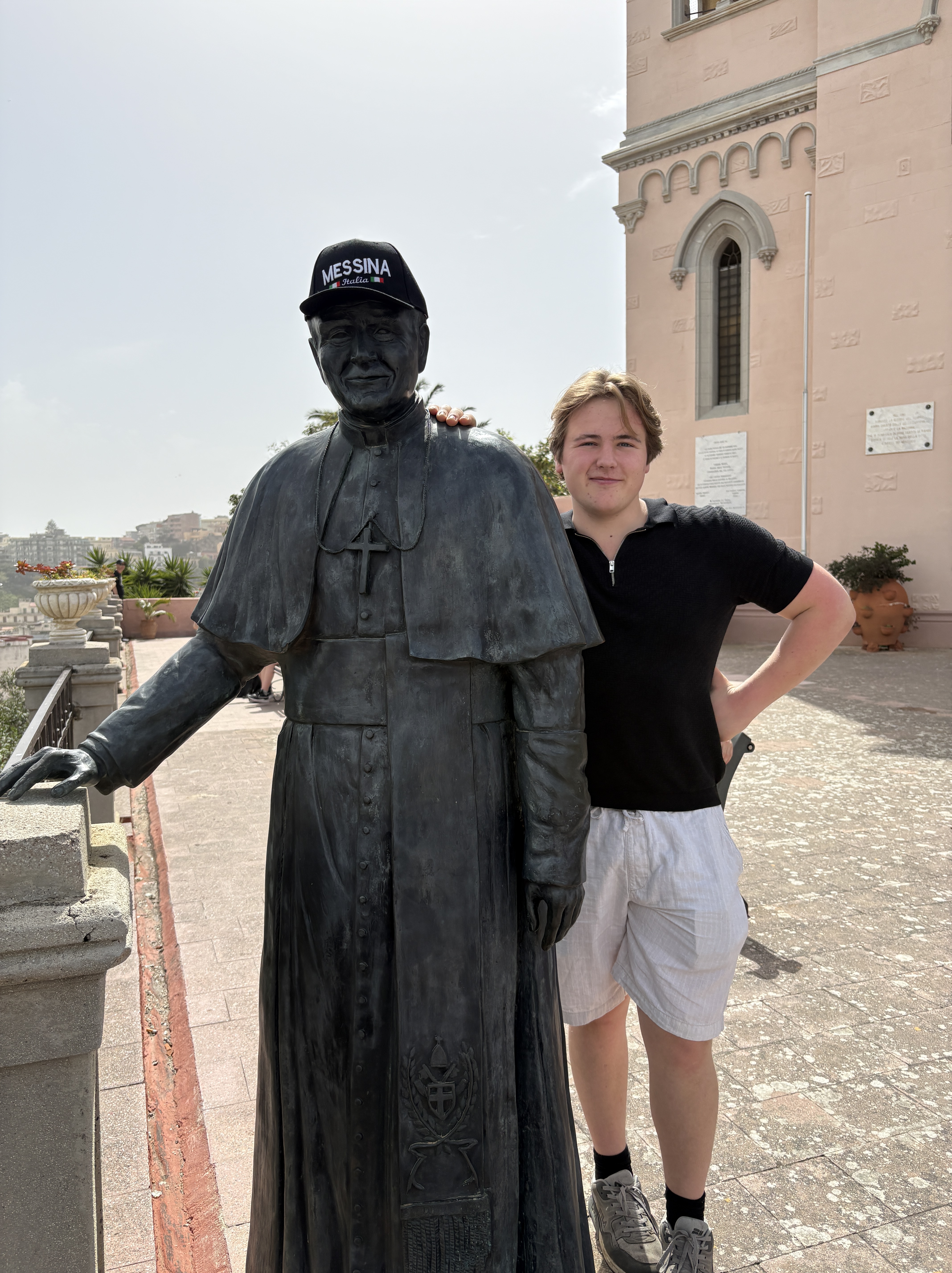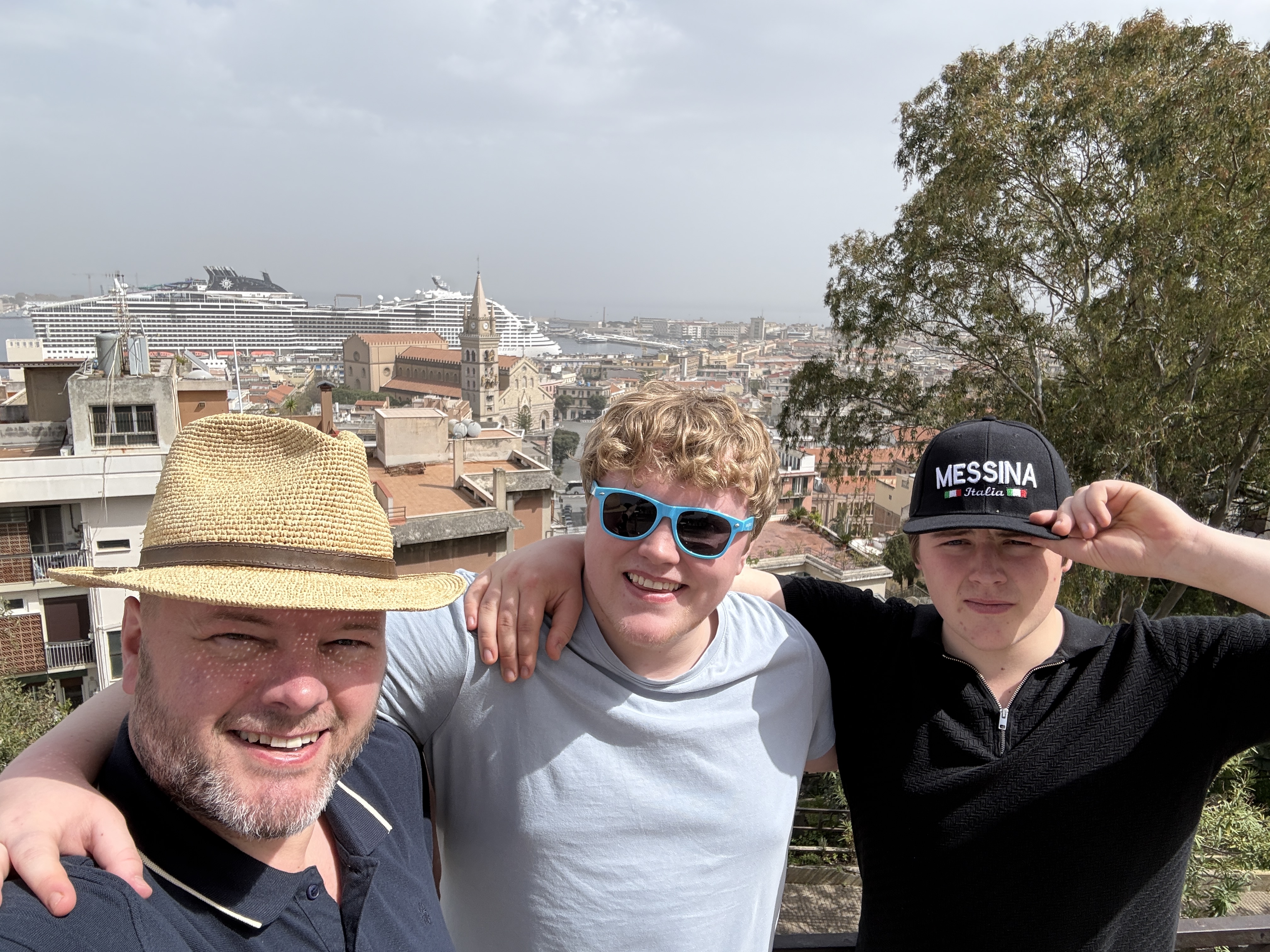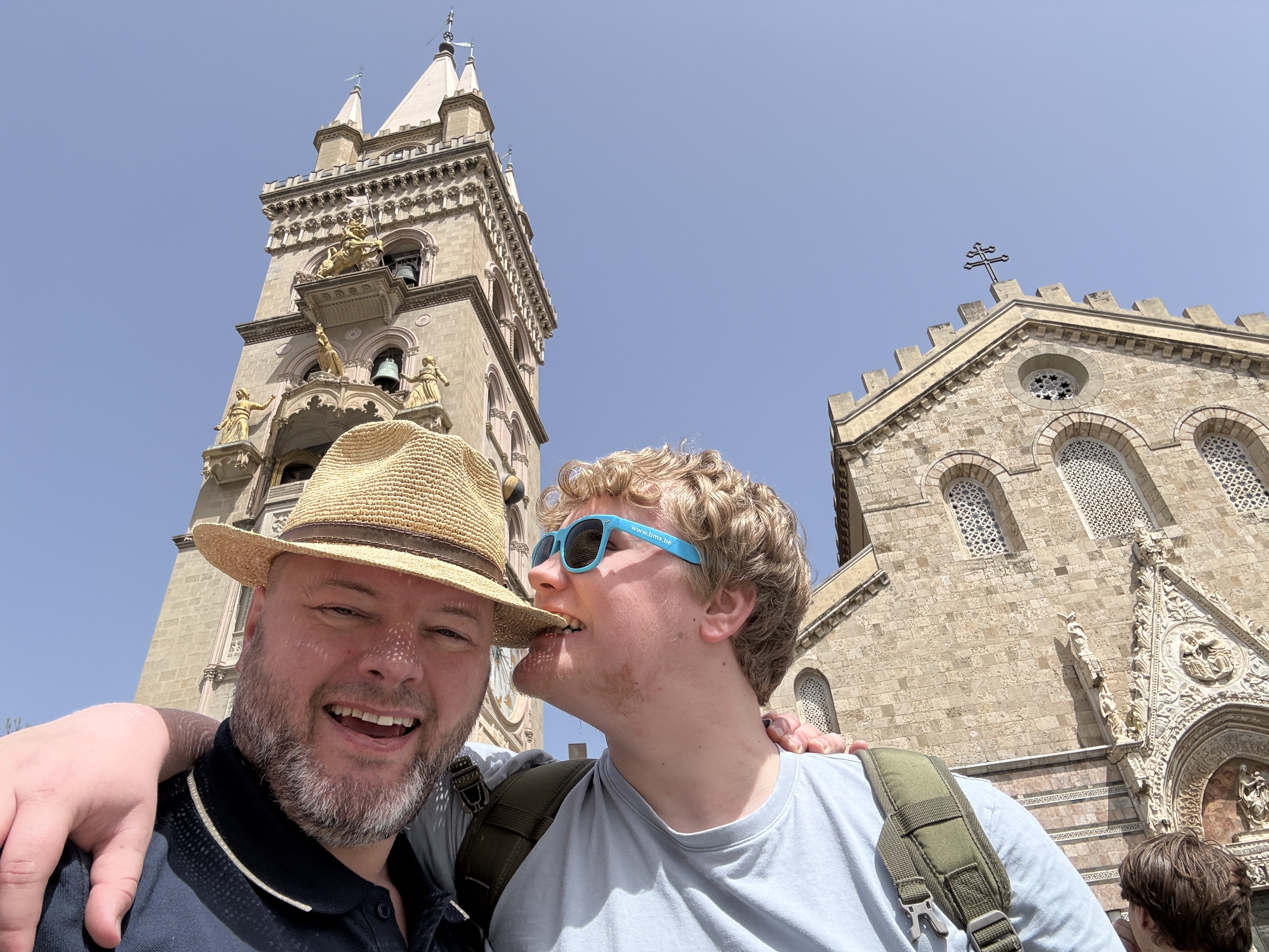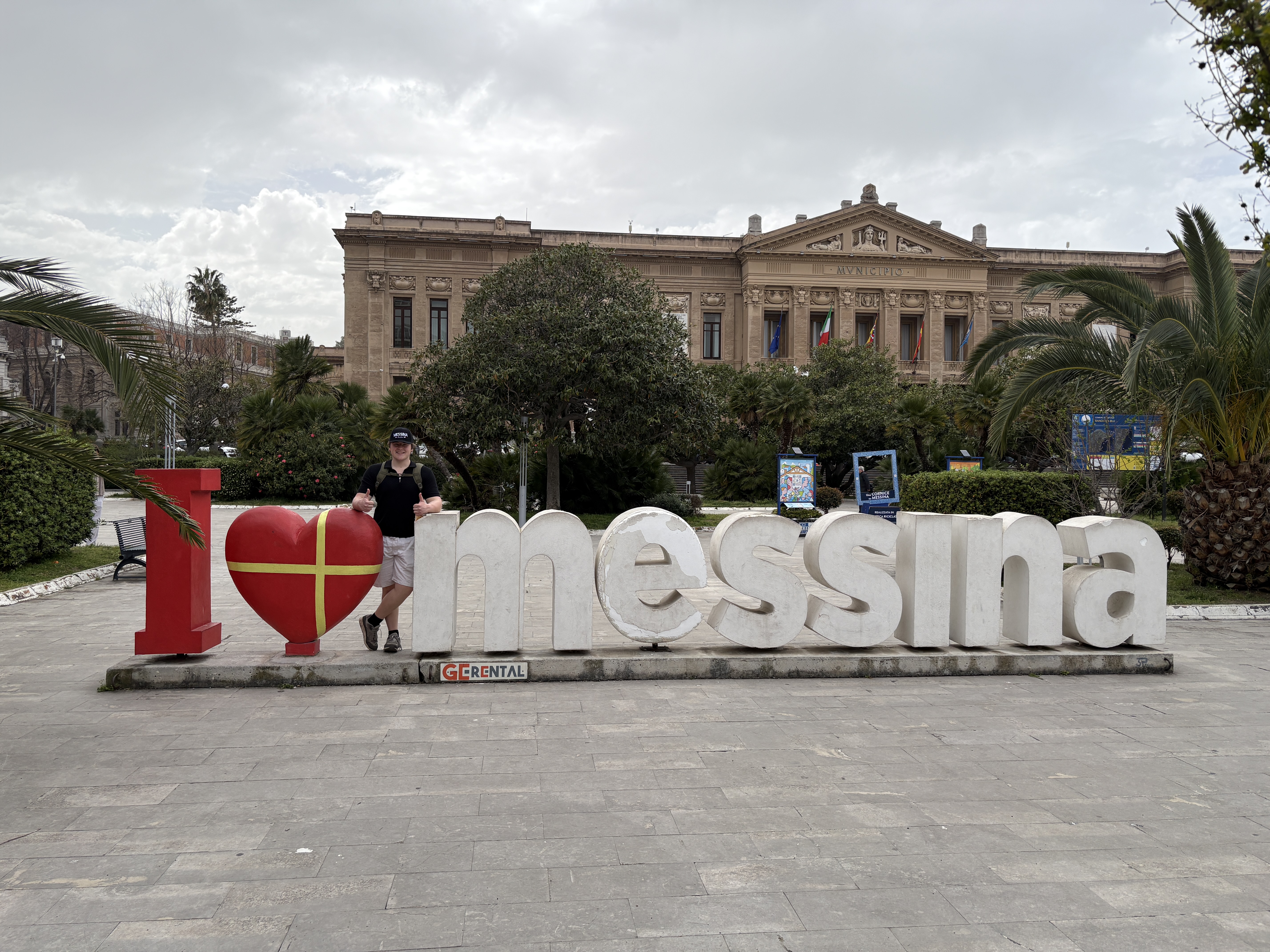 Nog snel een foto van Rune bij de “I ❤️ Messina”-letters aan het stadhuis — inclusief met “Messina Italia”-petje, waardoor hij er ondertussen uitziet als de lokale ambassadeur van de stad.