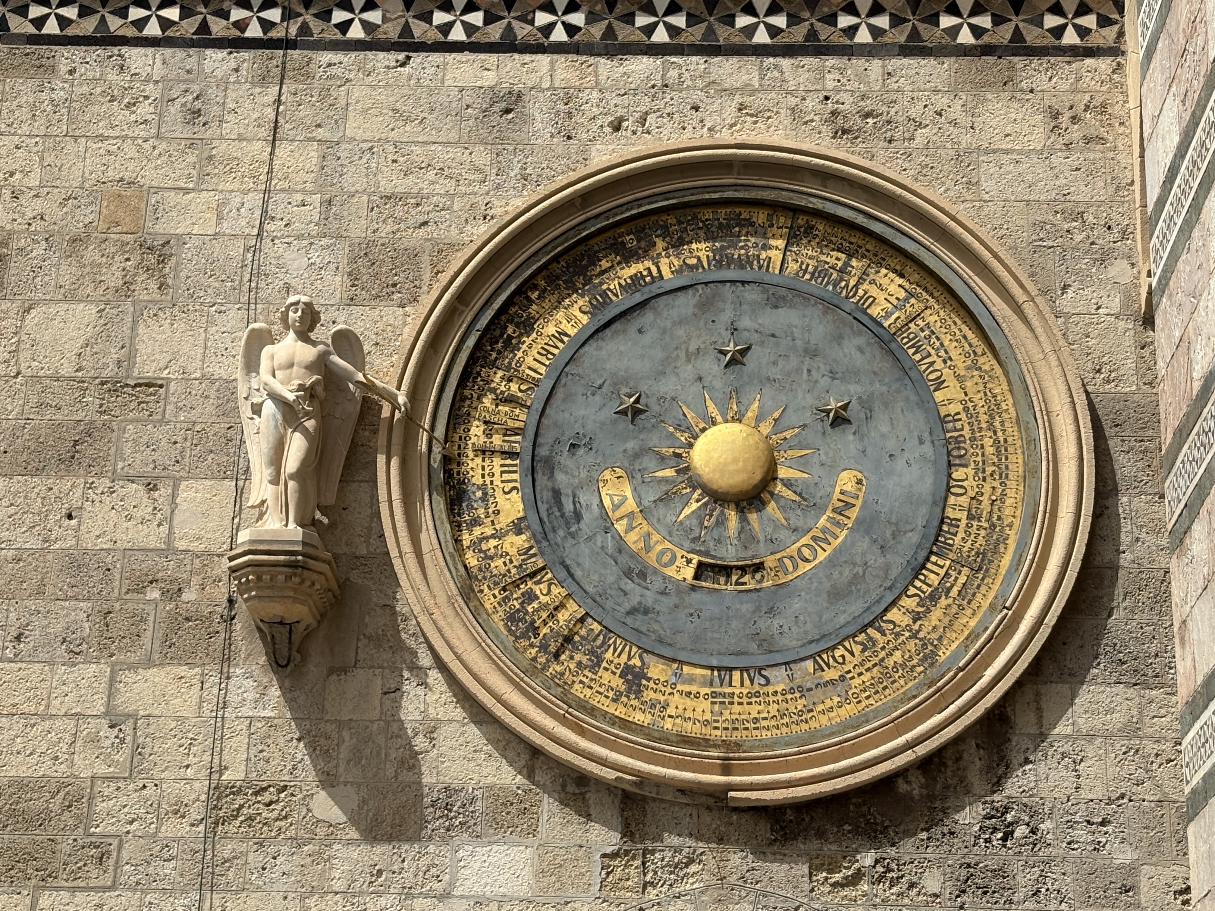 We starten onze wandeling bij de kathedraal van Messina. De blikvanger is de klokkentoren ernaast met zijn indrukwekkend astronomisch uurwerk — één van de grootste en meest complexe mechanische klokken ter wereld. Elke dag rond de middag komt het hele gevaarte tot leven met bewegende figuren, leeuwen, hanen en religieuze taferelen die zich netjes volgens een strak schema tonen aan het kijkvee. Een soort mechanisch theater.