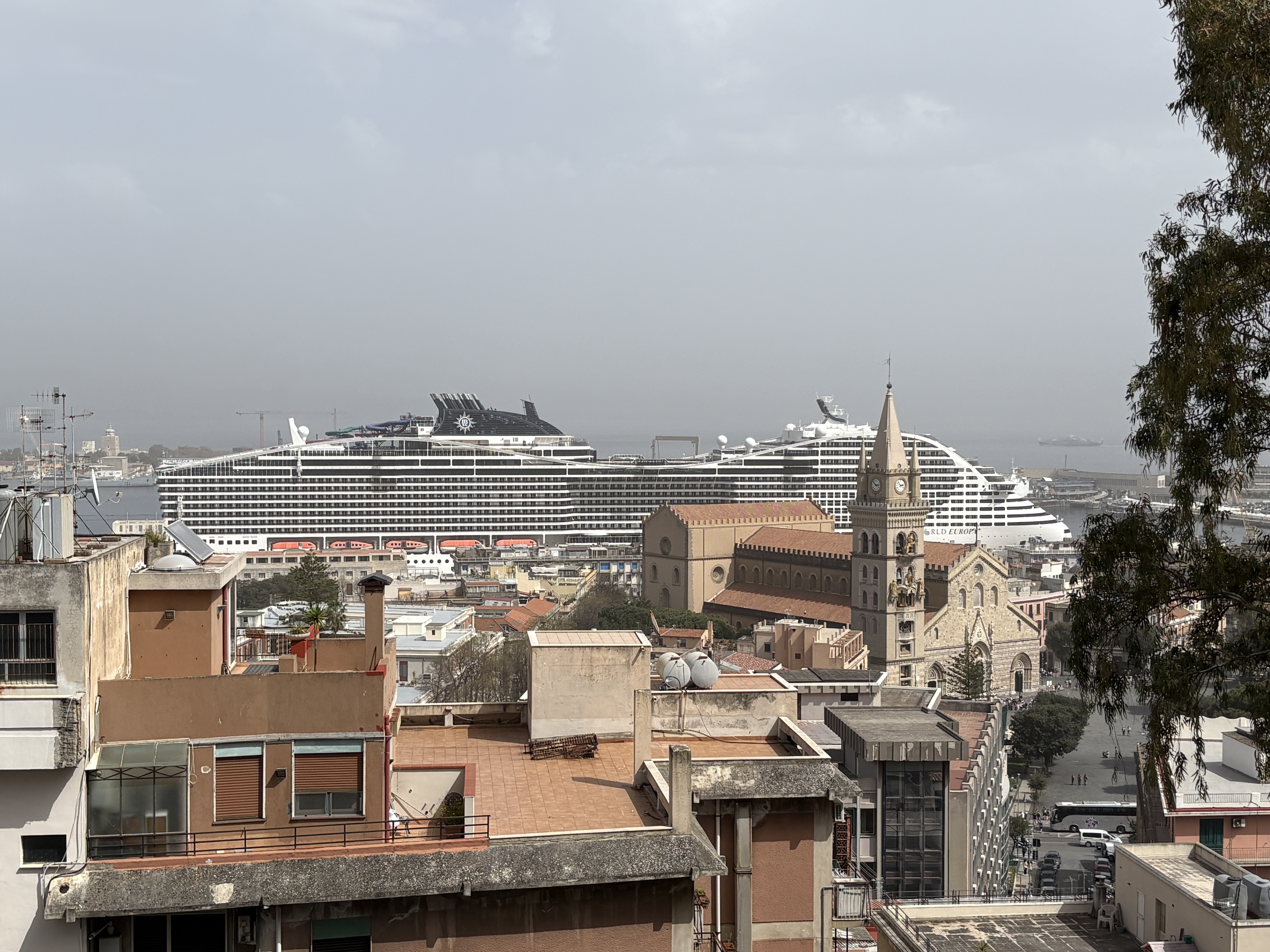 Terwijl wij twijfelen en uiteindelijk bestellen, glijdt de kustlijn van Messina langzaam voorbij. Een stad die zich nog wat op de achtergrond houdt, alsof ze zelf ook nog niet helemaal wakker is.