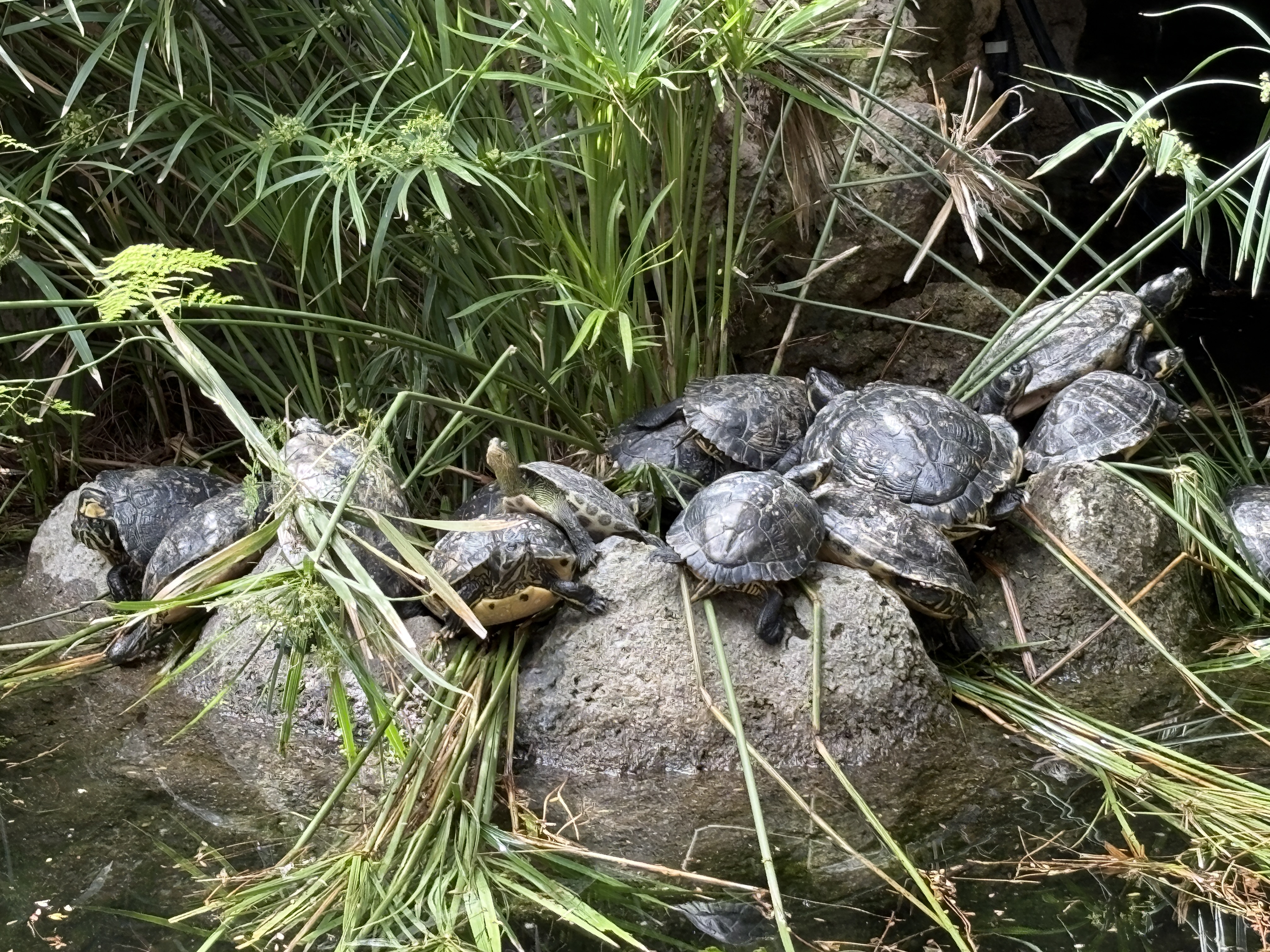 Met zijn nieuwe pet ontpopt hij zich tot lokale gids en wijst hij ons enthousiast op alles wat zijn aandacht trekt: fout geparkeerde auto’s, een vijvertje met schildpadden en goudvissen, fonteinen die het zonder water moeten stellen, nog meer fout geparkeerde auto’s. Het betere werk.