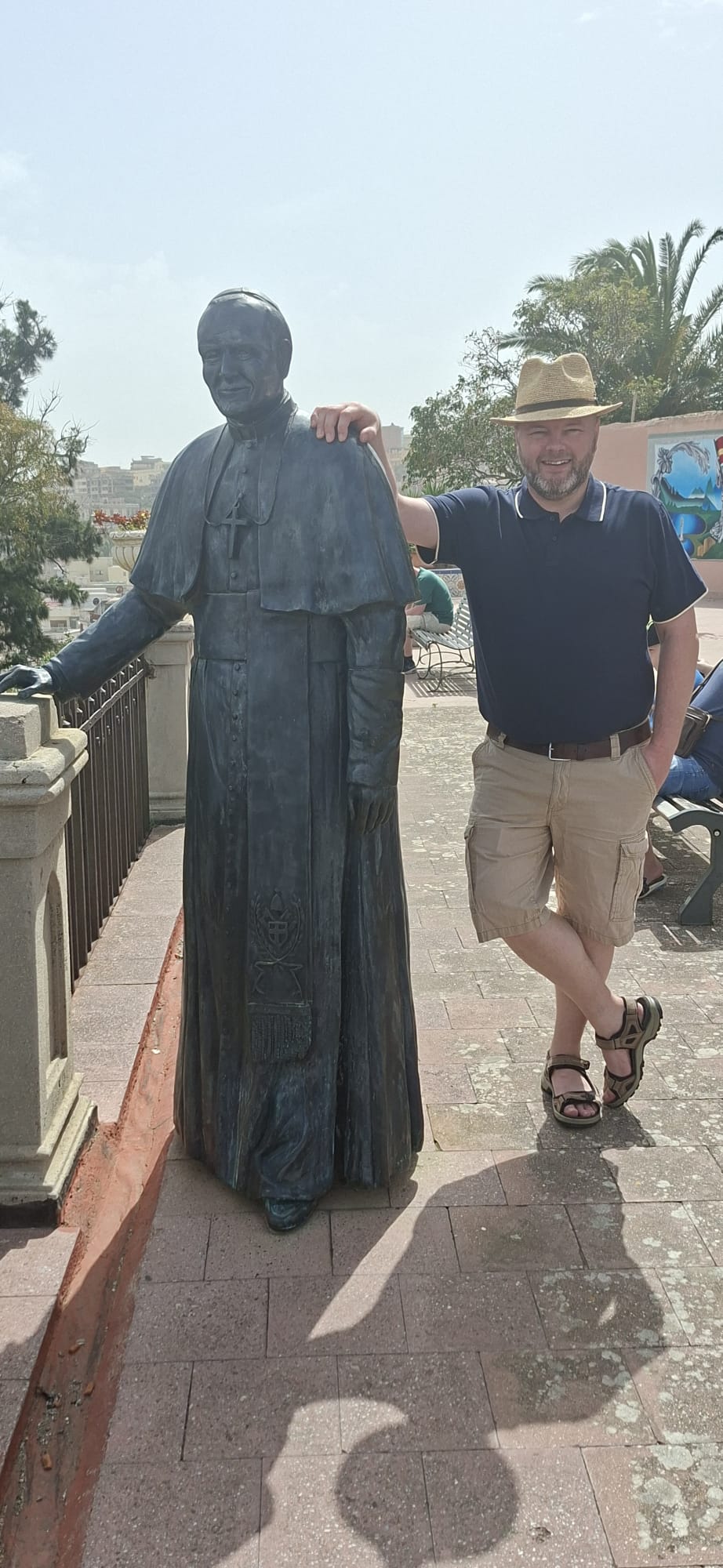 We wandelen verder naar het Santuario di Cristo Re, een kerkje op een heuvel net boven de haven, waar een standbeeld van Johannes Paulus de tweede (de tarmac-kusser) uitkijkt over de stad en alles wat binnen- en buitenvaart.