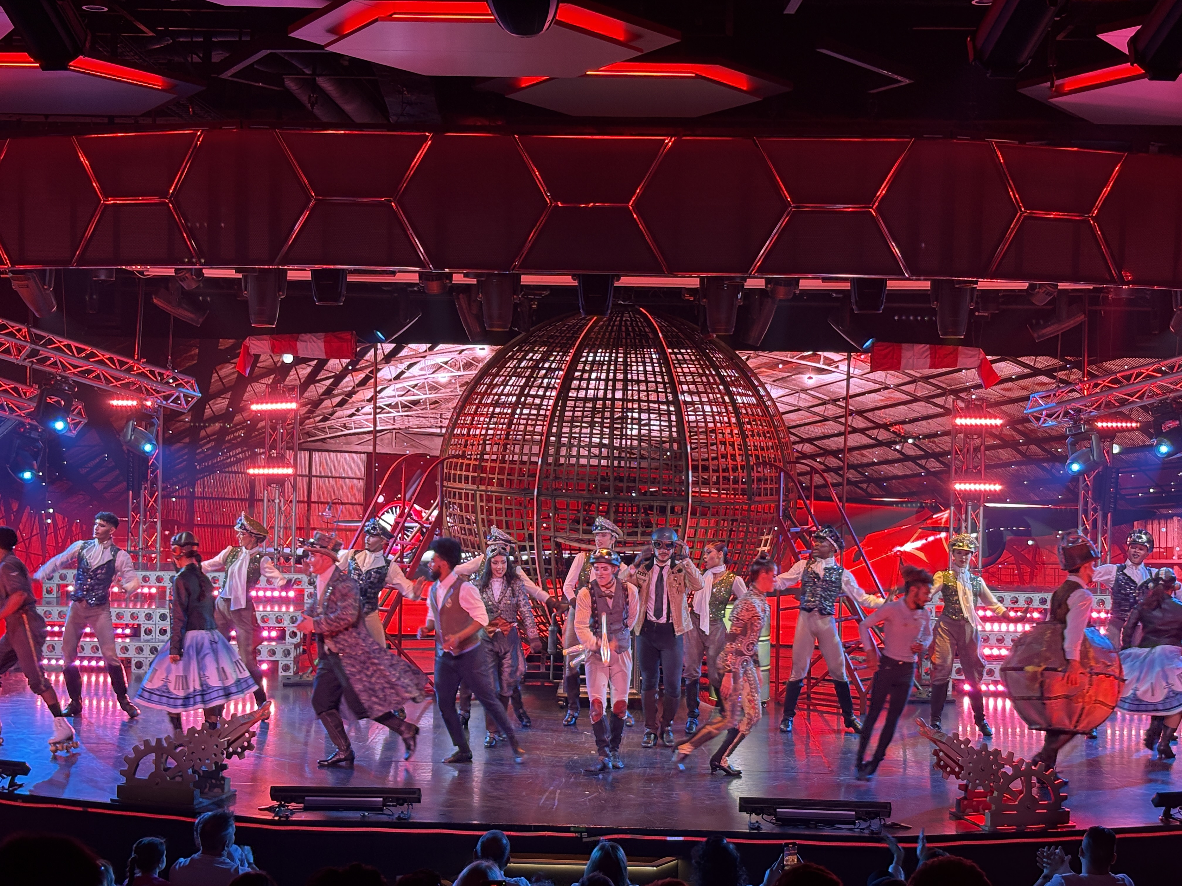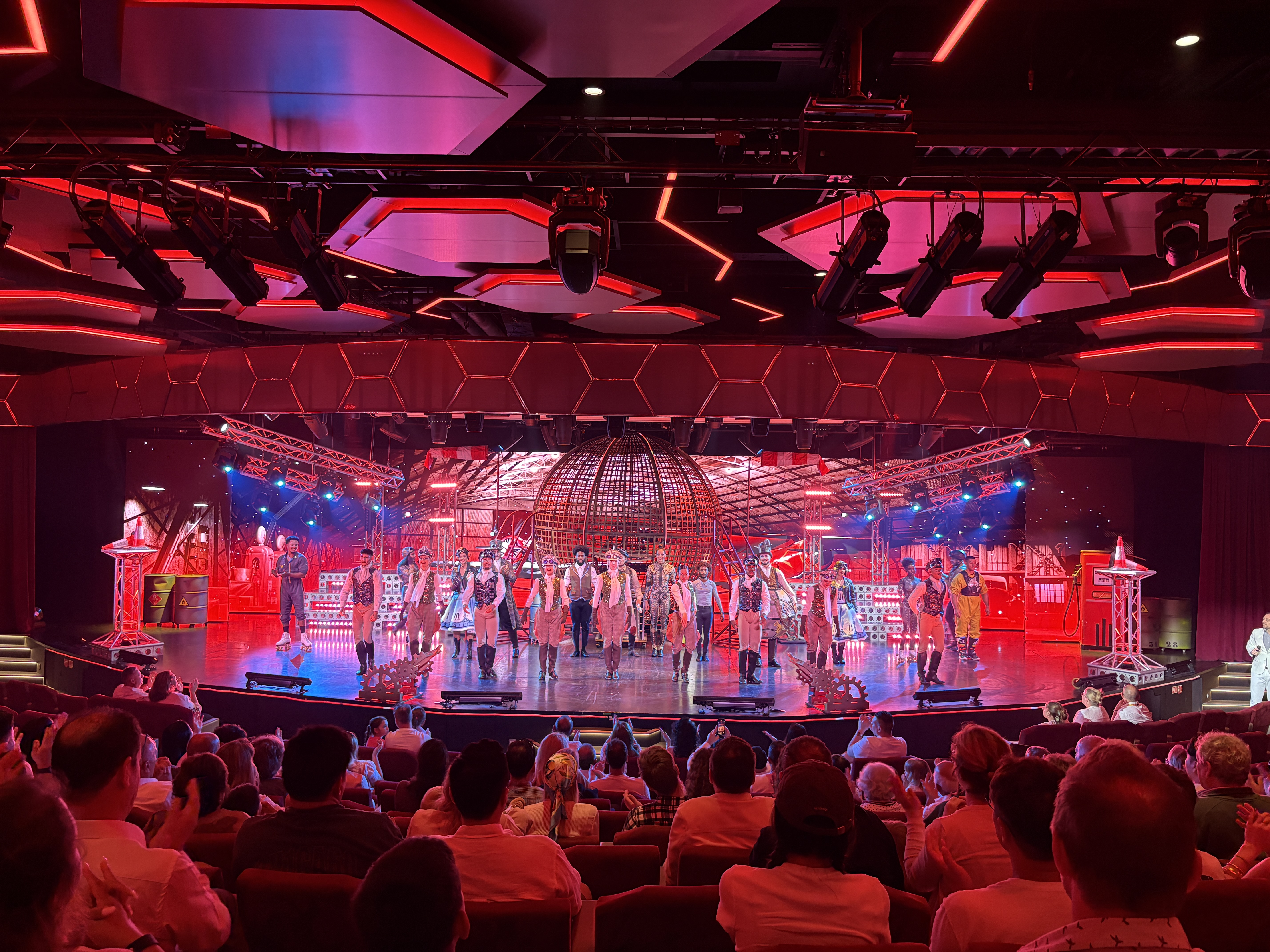 De show heet Amelia en draait volledig rond acrobatie. Wat volgt is zonder overdrijven de strafste show die we ooit op een cruise gezien hebben. Acrobaten die zich in bochten wringen waarvan je niet wist dat ze anatomisch mogelijk zijn, sprongen en lifts die perfect getimed zijn, en een constante spanning die door de zaal loopt.